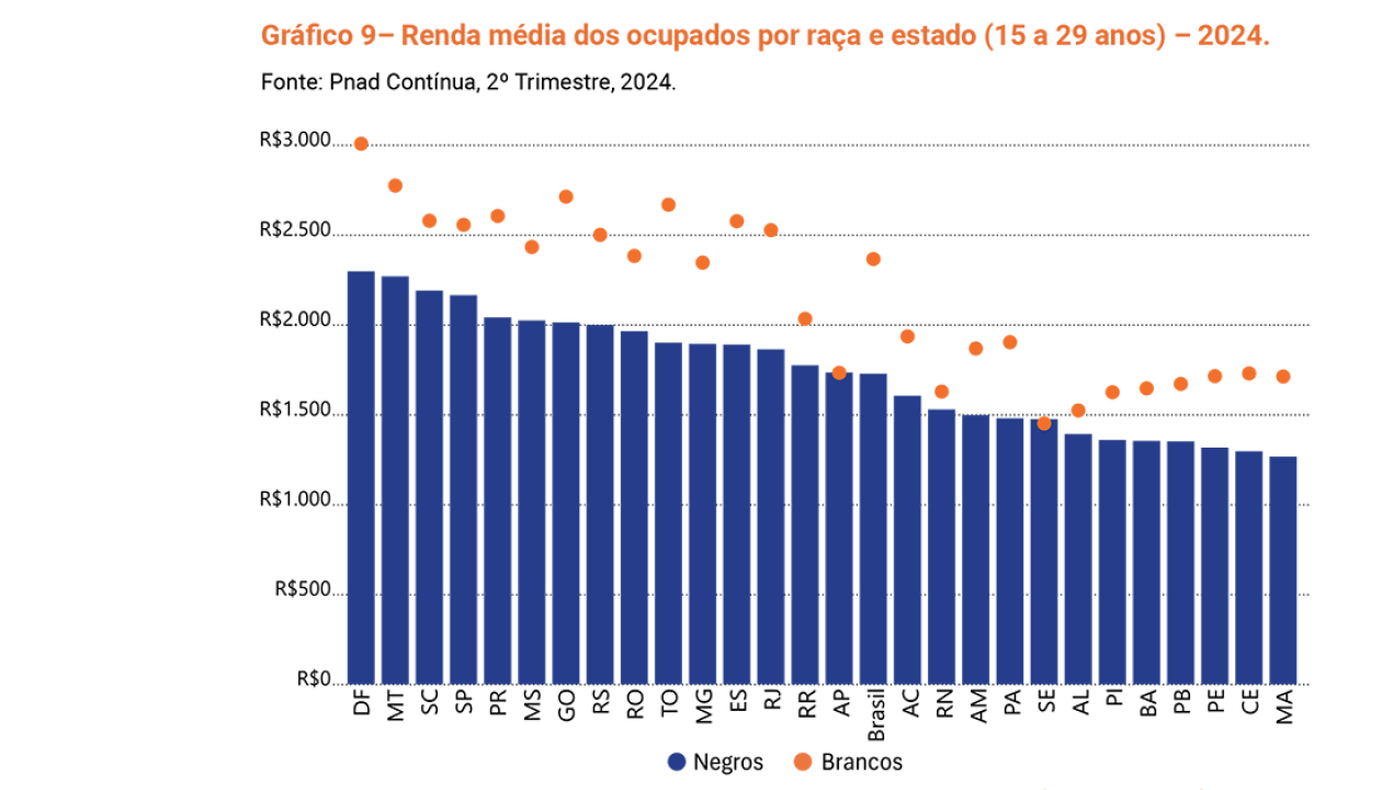• Disparidades Regionais: Estados do Sudeste e Sul (como São Paulo) apresentam maior exclusão dos jovens negros no mercado formal (que conta com maior presença de jovens brancos), mesmo oferecendo melhores salários e oportunidades, enquanto as regiões Norte e Nordeste mostram maior presença de jovens negros, mas com menor renda média.