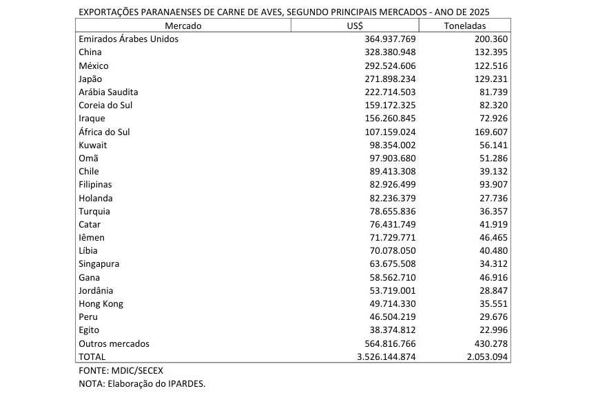 Além de ocupar a liderança no ranking nacional da produção de carne de aves, com 2,29 bilhões de animais processados em 2025, o Estado do Paraná também encabeça a lista dos maiores exportadores, destinando, ao mercado internacional, com 2,05 milhões de toneladas do produto no ano passado, o que gerou receitas da ordem de US$ 3,53 bilhões.