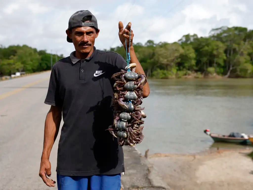 O pescador Bruno do Rosário da Silva vende caranguejos na ponte do Furo Grande, na área da Reserva Extrativista Marinha de Caeté-Taperaçu, em Bragança, no Pará (Fernando Frazão/ABr)Transparência