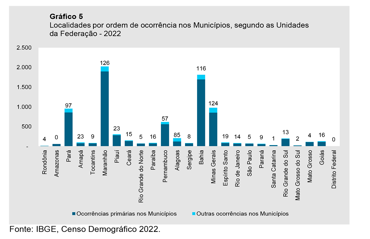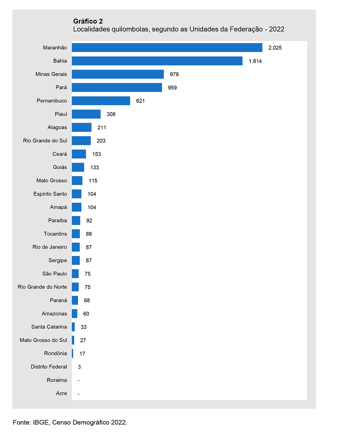 Segundo o ‘Censo Demográfico 2022: Localidades Quilombolas’, publicado pelo Instituto Brasileiro de Geografia e Estatística (IBGE), existiam 8.441 localidades quilombolas no território brasileiro, associadas a 7.666 comunidades quilombolas. A Região Nordeste possui o maior quantitativo de localidades identificadas, com 5.386 (63,81%) ocorrências, enquanto o Maranhão é o estado com o maior número, com 2.025 localidades (23,99%).