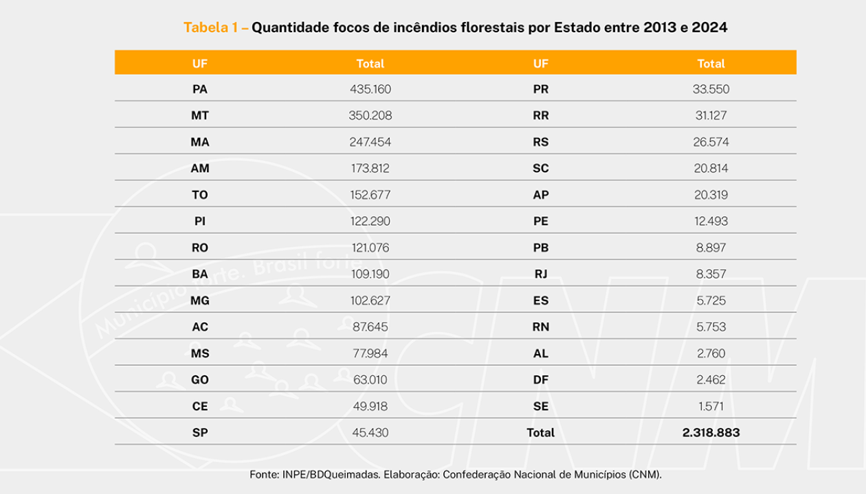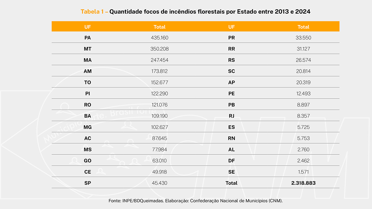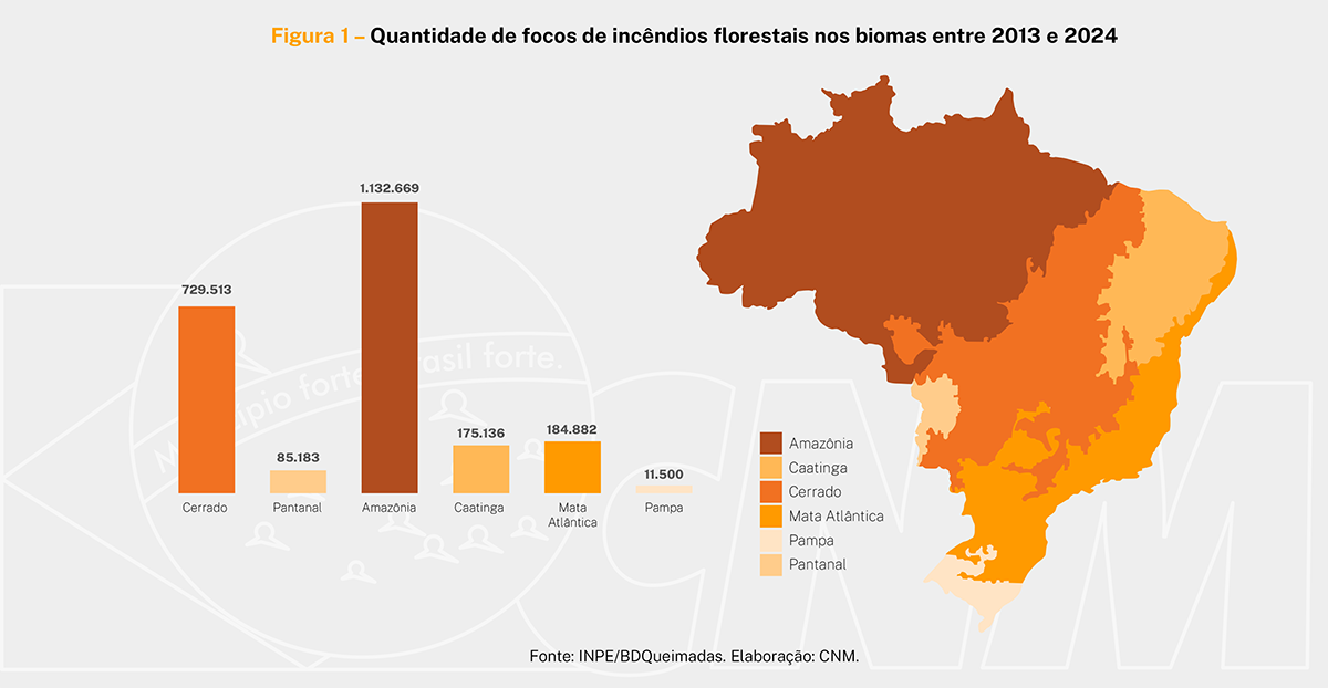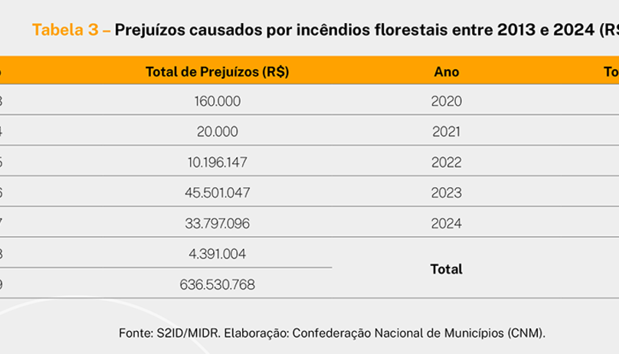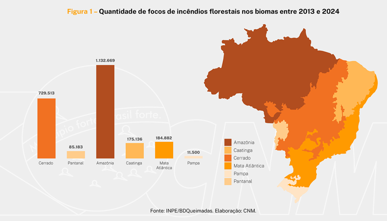 O levantamento da Confederação Nacional de Municípios (CNM) intitulado “Incêndios Florestais e seus Impactos nos Municípios Brasileiros” analisou dados entre 2013 e 2024 e constatou que, nesse período, o Brasil registrou 2.318.883 focos de incêndios florestais (o que corresponde a uma média de 193,2 mil focos por ano), com 24,7 milhões de pessoas afetadas e cerca de R$ 3,3 bilhões em prejuízos.