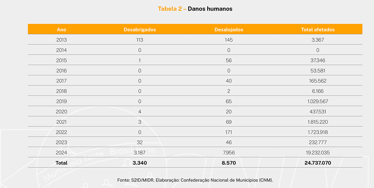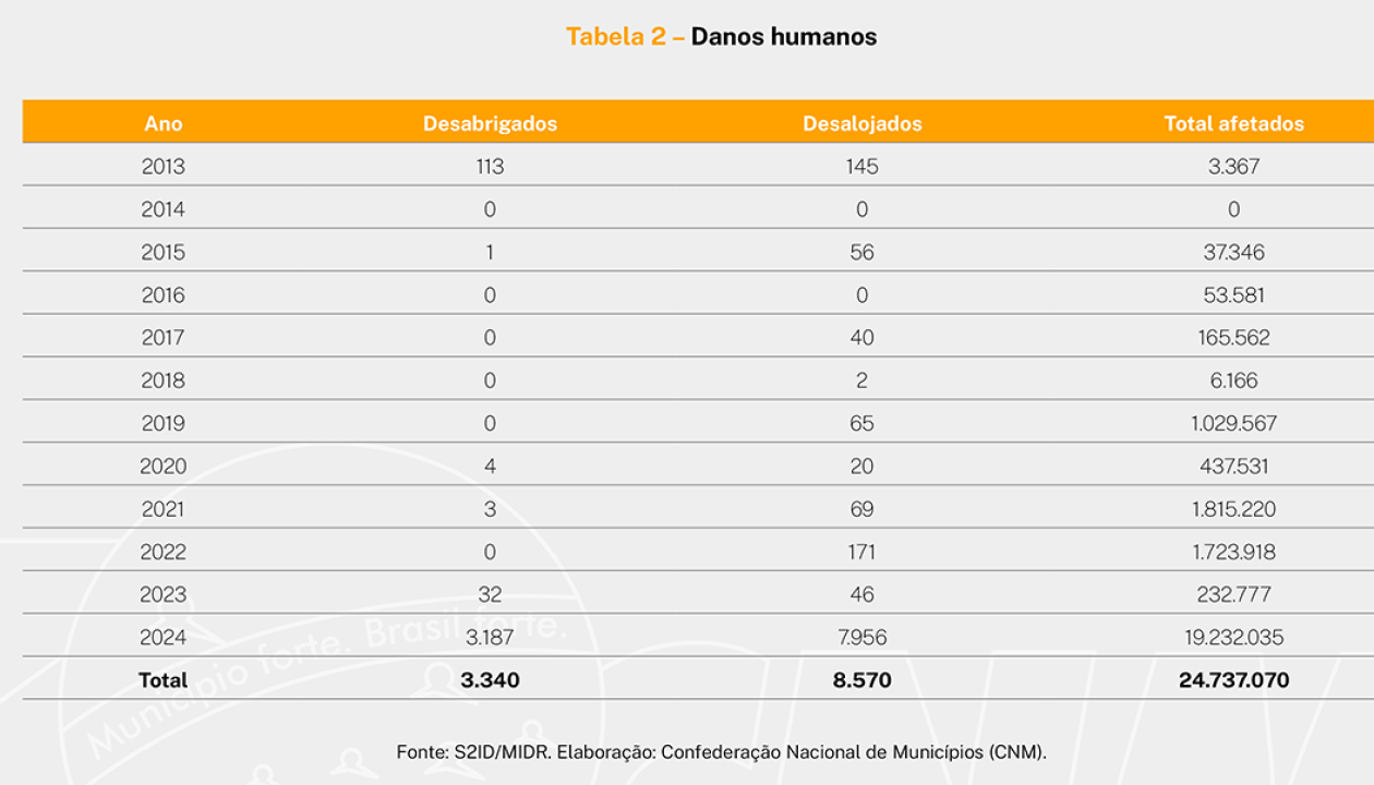 A CNM constatou que os anos de 2024, 2020 e 2015 foram os mais afetados, correspondendo a quase 30,9% do total de 2,3 milhões nos últimos 12 anosO estudo detalha os danos humanos, materiais e ambientais, além dos prejuízos econômicos em setores como o agronegócio, a pecuária e a infraestrutura pública municipal. De 2013 a 2023, foram 5,4 milhões de pessoas afetadas e R$ 1,1 bilhão em perdas municipais. Portanto, os dados de 2024 representam 65,4% do total dos últimos 12 anos. No mesmo intervalo, a União repassou R$ 1,5 bilhão para prevenção e combate, valor inferior à metade das perdas municipais e correspondente a 67% do que foi autorizado no Orçamento.
