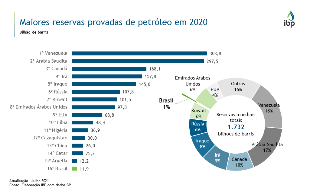 Dentre os países, a Venezuela continua detentora do maior volume de reservas petrolíferas, com 303 bilhões de barris (16,9% do total mundial). As reservas sauditas mantiveram-se estáveis, totalizando 267,2 bilhões de barris (14,9% do total mundial), o que manteve a Arábia Saudita na segunda posição do ranking mundial de reservas provadas de petróleo. O Brasil ocupa a 15ª posição no ranking mundial de reservas provadas de petróleo, com um volume de 15,9 bilhões de barris.