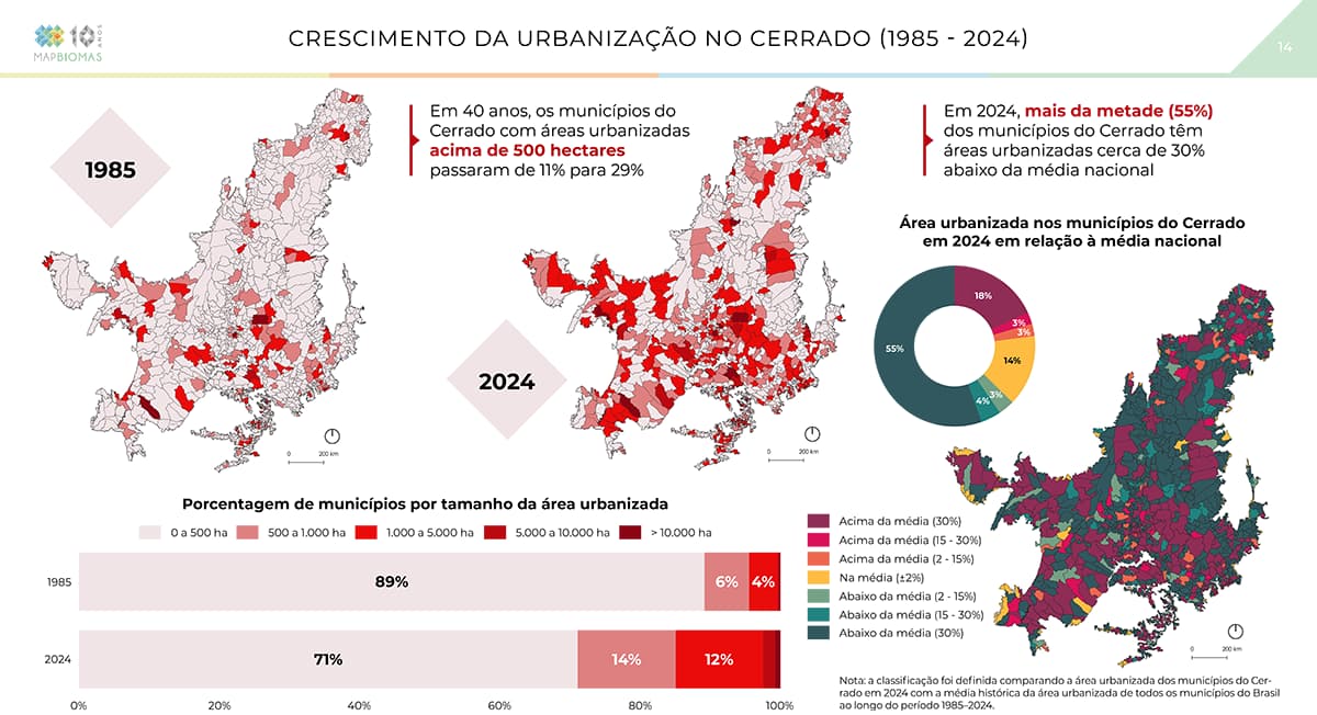 A agropecuária era predominante em 42% dos municípios do Cerrado, no ano inicial do estudo. Passados 40 anos, esse percentual passou a 58%, enquanto que os municípios com mais de 80% da vegetação nativa no Cerrado, em 2024, representam apenas 16% do total.