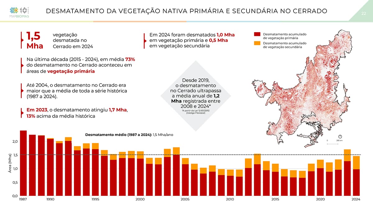 De acordo com o Ministério da Ciência, Tecnologia e Inovação, entre agosto de 2024 e julho de 2025, o Cerrado registrou uma queda de 20,8% da área sob alerta de desmatamento, mas 5.555 km² de área do bioma ainda permaneceu sob alerta, entre agosto de 2024 e julho de 2025.