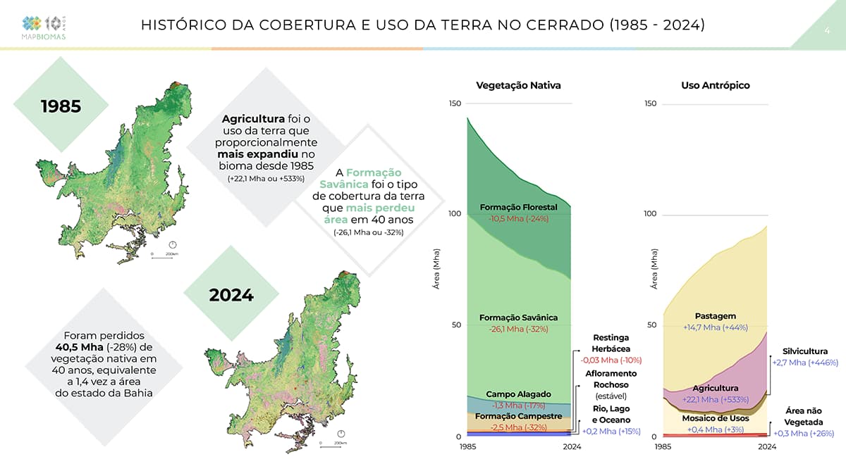 Uma análise dos dados da série histórica do Mapbiomas sobre o uso do solo no Brasil traz dados alarmantes sobre o Cerrado, que ocupa 23,3% de todo o território do país. De acordo com o estudo, em 40 anos, o bioma perdeu 40,5 milhões de hectares, equivalentes a 28% de vegetação nativa.