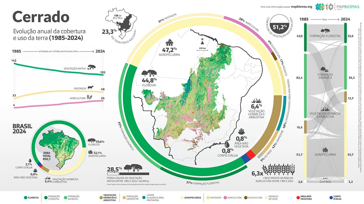 Essa mudança, somada ao que já havia sido transformado antes do período entre 1985 e 2024, resulta em uma transformação total de quase metade, 47,9%, do Cerrado.