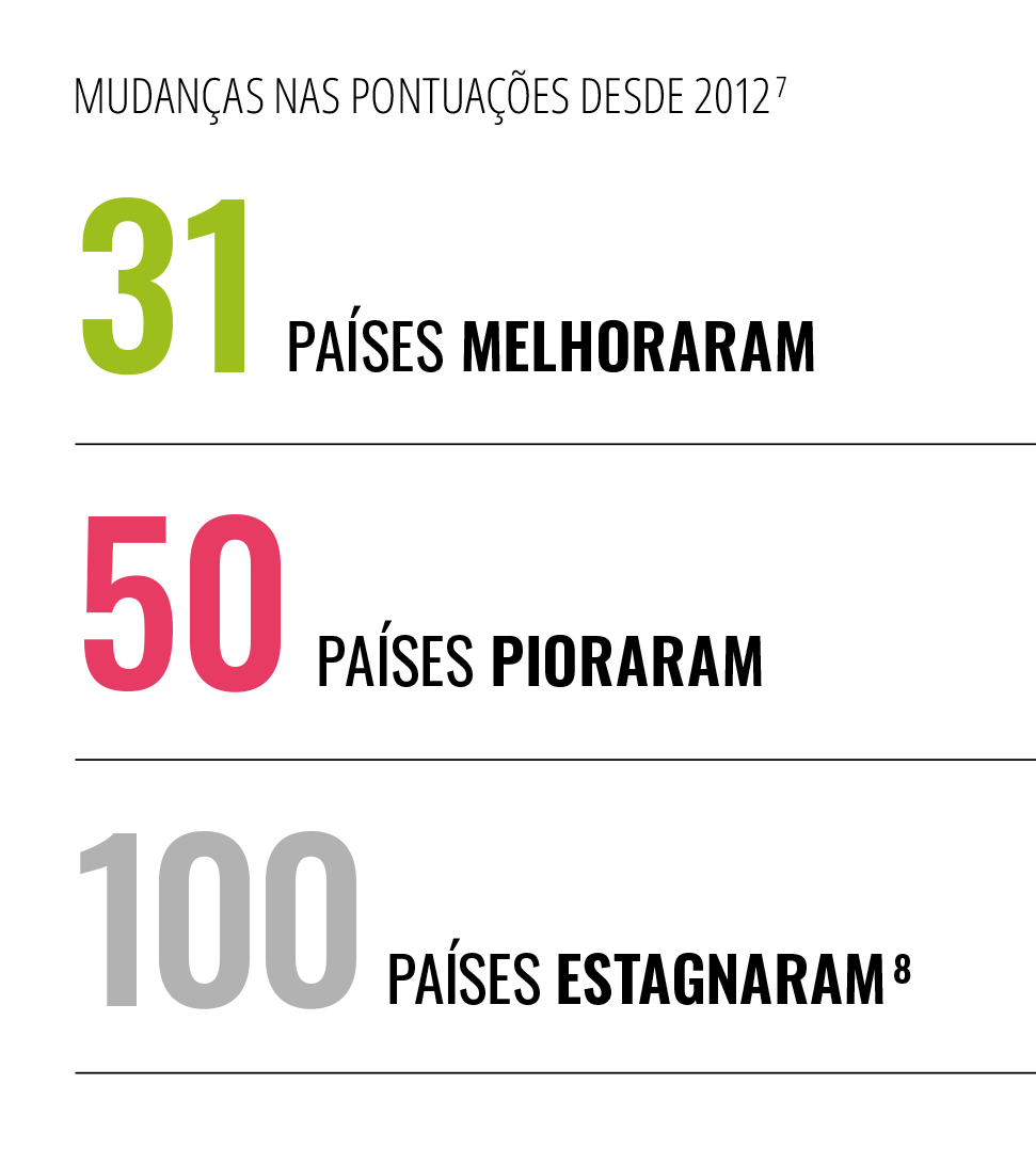 A maioria dos países não conseguiu controlar o avanço da corrupção: de um total de 180 avaliações, 122 alcançaram menos de 50 pontos no índice. Paralelamente, o número de países que lograram uma pontuação acima de 80 diminuiu, caindo de 12 para cinco em apenas uma década.