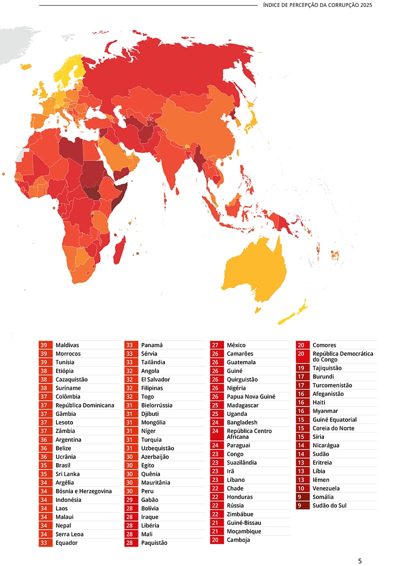 No Índice de Percepção da Corrupção 2025, o Brasil obteve 35 pontos, ocupando a 107ª posição entre 182 países e territórios avaliados.