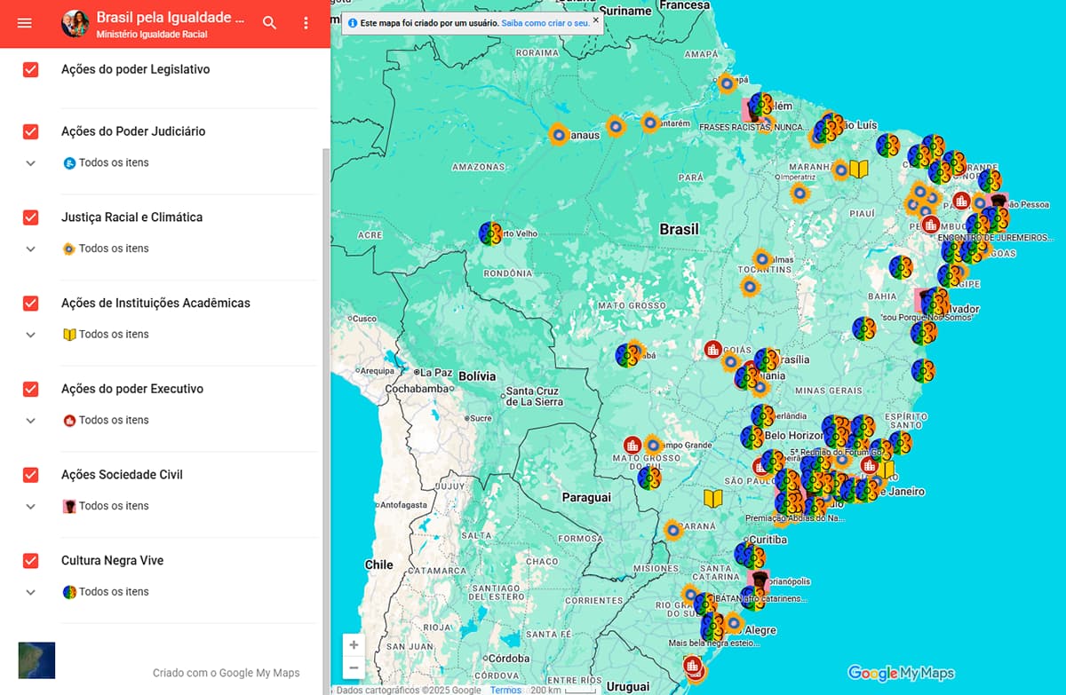 O Mapa da Igualdade Racial reúne eventos e ações por todo o país que tenham relação com o ‘Novembro Negro’. Organizado pelo Ministério da Igualdade Racial (MIR), a ação tem como objetivo ampliar a visibilidade das atividades que valorizam o legado e as lutas da população negra e funciona de forma colaborativa.