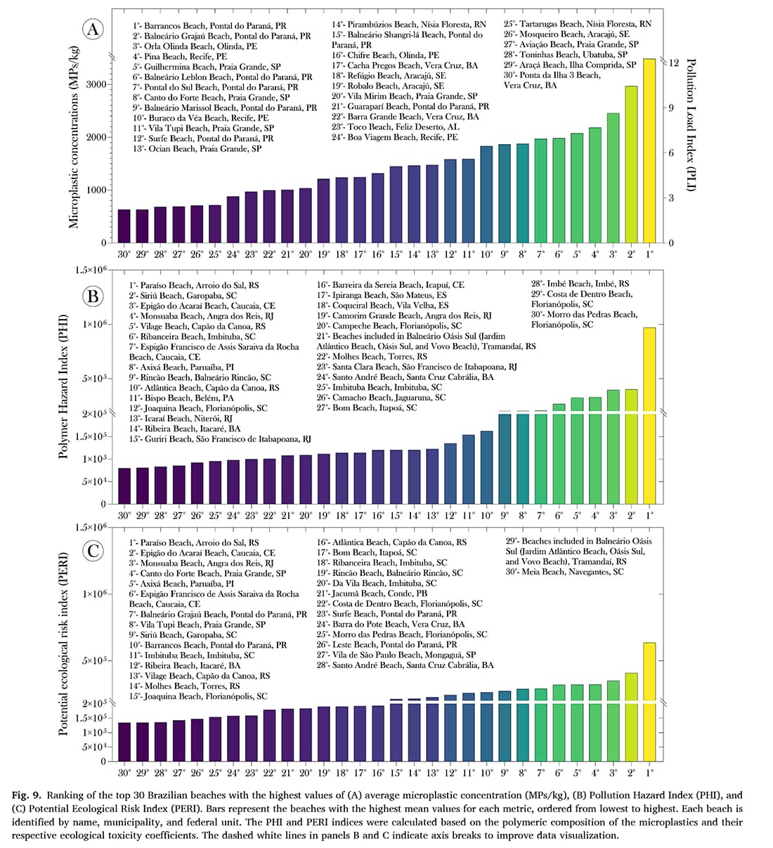 Além do ranking das 30 principais praias brasileiras com os maiores valores de concentração média de microplásticos (MPs/kg), o estudo também apresenta outros dois rankings: Índice de Perigo de Poluição (PHI) e o Índice de Risco Ecológico Potencial (PERI).