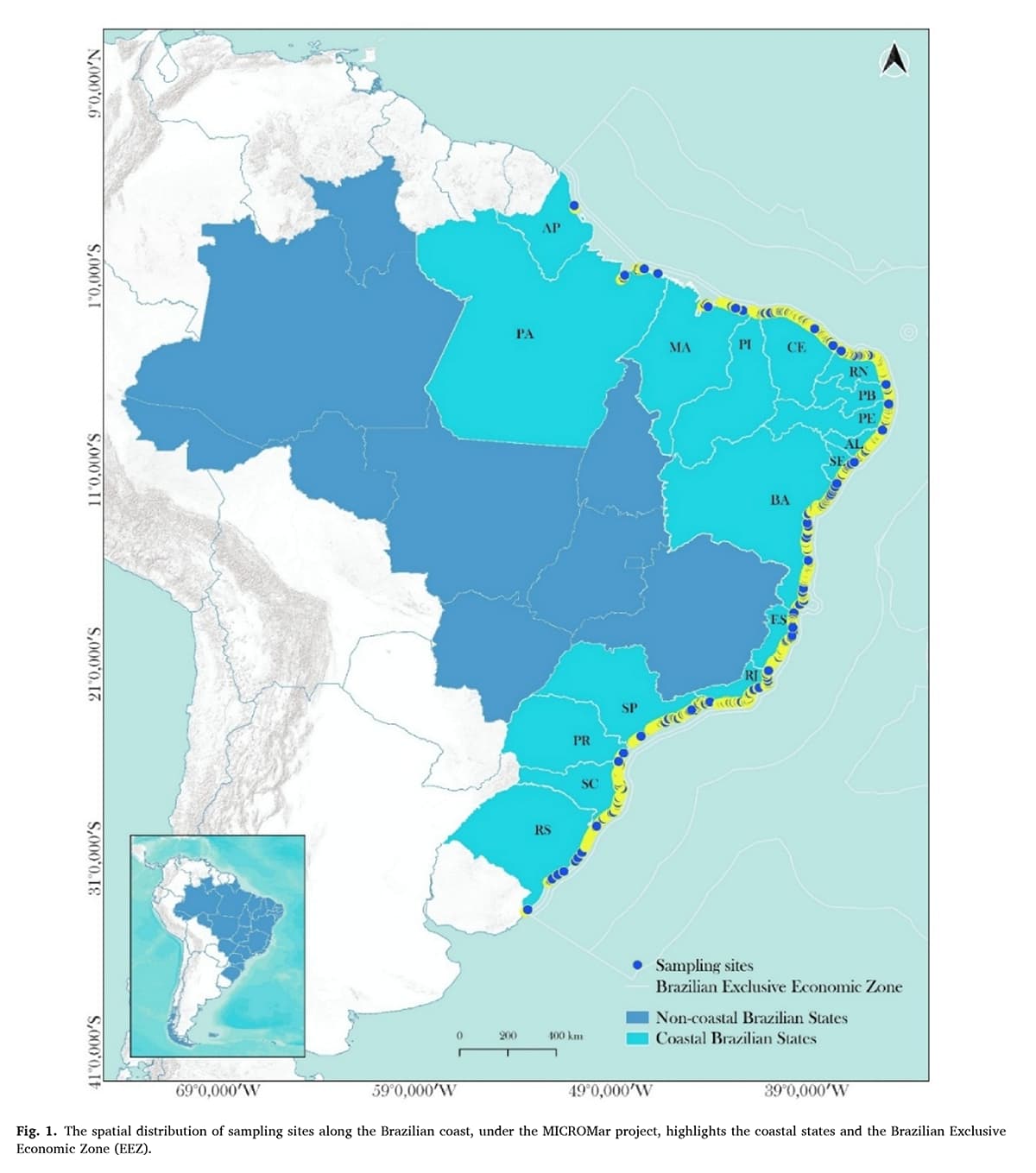 Fonte: Microplastic pollution across the Brazilian coastline: Evidence from the MICROMar project, the largest coastal survey in the Global South; A distribuição espacial dos locais de amostragem ao longo da costa brasileira, no âmbito do projeto MICROMar, destaca os estados costeiros e a Zona Econômica Exclusiva (ZEE) brasileira.A seleção do local considerou a cobertura geográfica, a diversidade ambiental e morfológica, o nível de urbanização e a proximidade de potenciais fontes de poluição (terminais portuários, emissários de esgoto, pontos turísticos e empreendimentos costeiros).