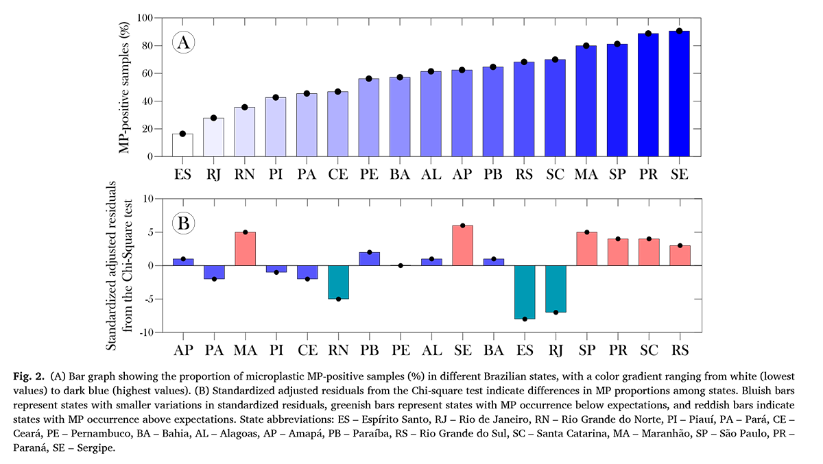 Fonte: Microplastic pollution across the Brazilian coastline: Evidence from the MICROMar project, the largest coastal survey in the Global South; A) Proporção de amostras positivas para microplásticos (%, com um gradiente de cores variando do branco (valores mais baixos) ao azul escuro (valores mais altos); (B) Resíduos padronizados ajustados do teste do qui-quadrado indicam diferenças nas proporções de microplásticos entre os estados. As barras azuladas representam estados com menores variações nos resíduos padronizados, as barras esverdeadas representam estados com ocorrência de MP abaixo do esperado e as barras avermelhadas indicam estados com ocorrência de MP acima do esperado.No total, foram identificados 24.549 microplásticos, que apresentaram considerável variabilidade em cor, tamanho, forma e morfotipo. Entre 21 tipos comuns de polímeros, os mais encontrados pelos pesquisadores foram polietileno (PE), poliestireno expandido (EPS) e polipropileno (PP), dominados pelas cores branca, verde e azul, predominando em todos os estados, representando, juntos, aproximadamente 60% dos MP identificados.