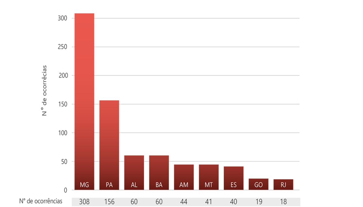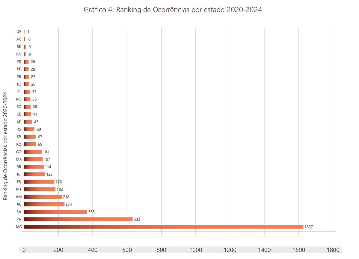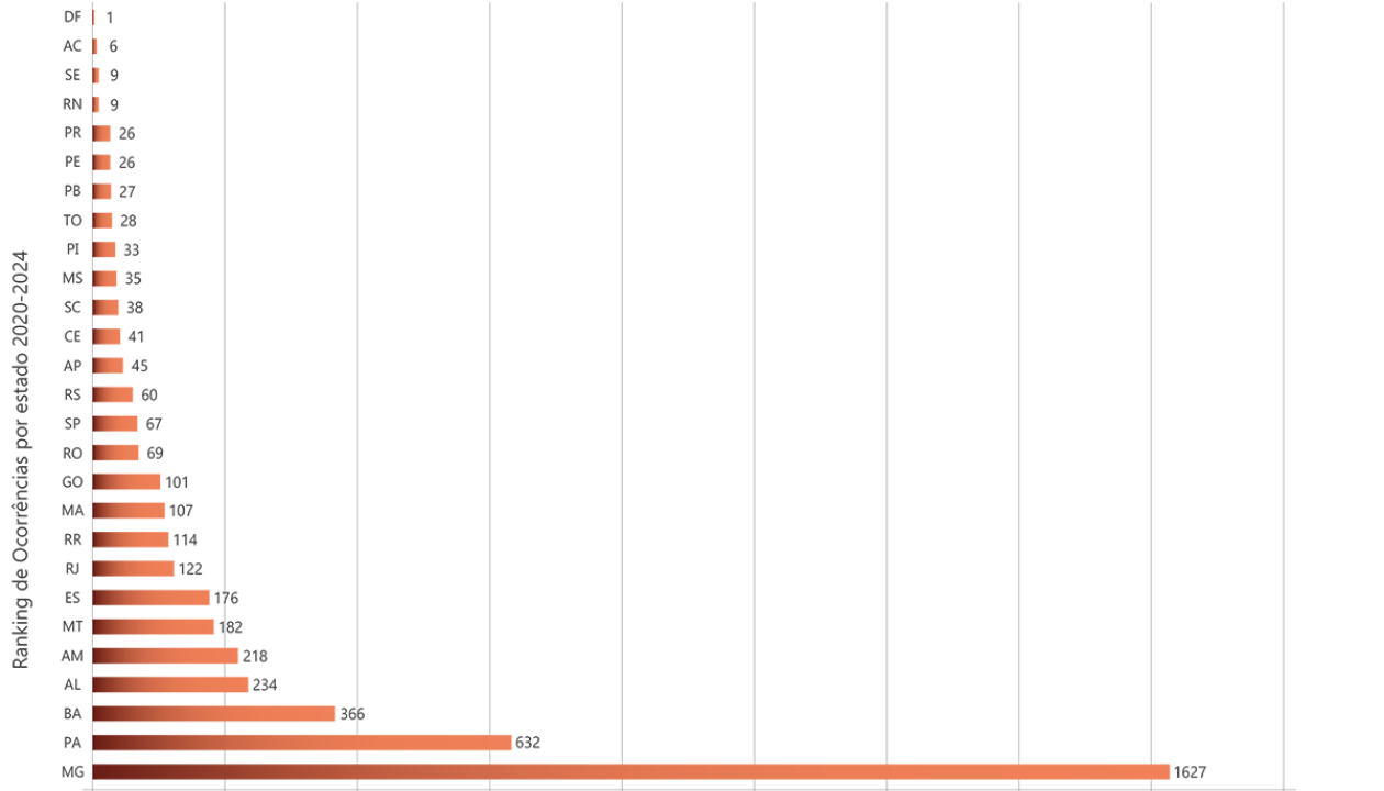 Fonte: Conflitos da Mineração no Brasil 2024Dos 26 estados com registros, os que mais concentraram ocorrências de conflito foram Minas Gerais (35,2%), Pará (17,8%), Bahia e Alagoas (6,9%). Minas Gerais também liderou o número de pessoas atingidas (77%), seguido por Pará (8%) e Alagoas (6,5%).