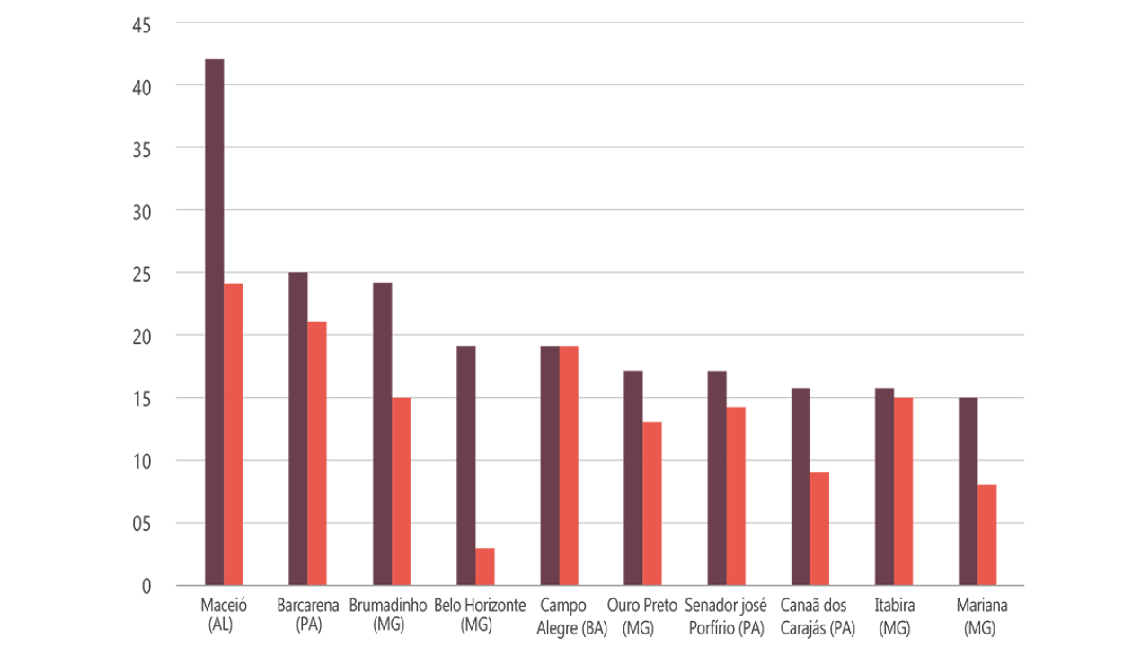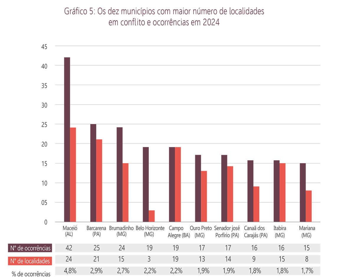 As cidades de Maceió (AL), Barcarena (PA) e Brumadinho (MG) lideram o ranking nacional de municípios com o maior número de conflitos e ocorrências causados pela mineração. Em 2024, pela primeira vez desde o início do mapeamento do Observatório dos Conflitos da Mineração no Brasil, Brumadinho (24) não foi o município com mais localidades em conflito no país, sendo superado por Maceió (42). O caso de Brumadinho (24) refere-se aos desdobramentos do rompimento da barragem da Vale S.A.
