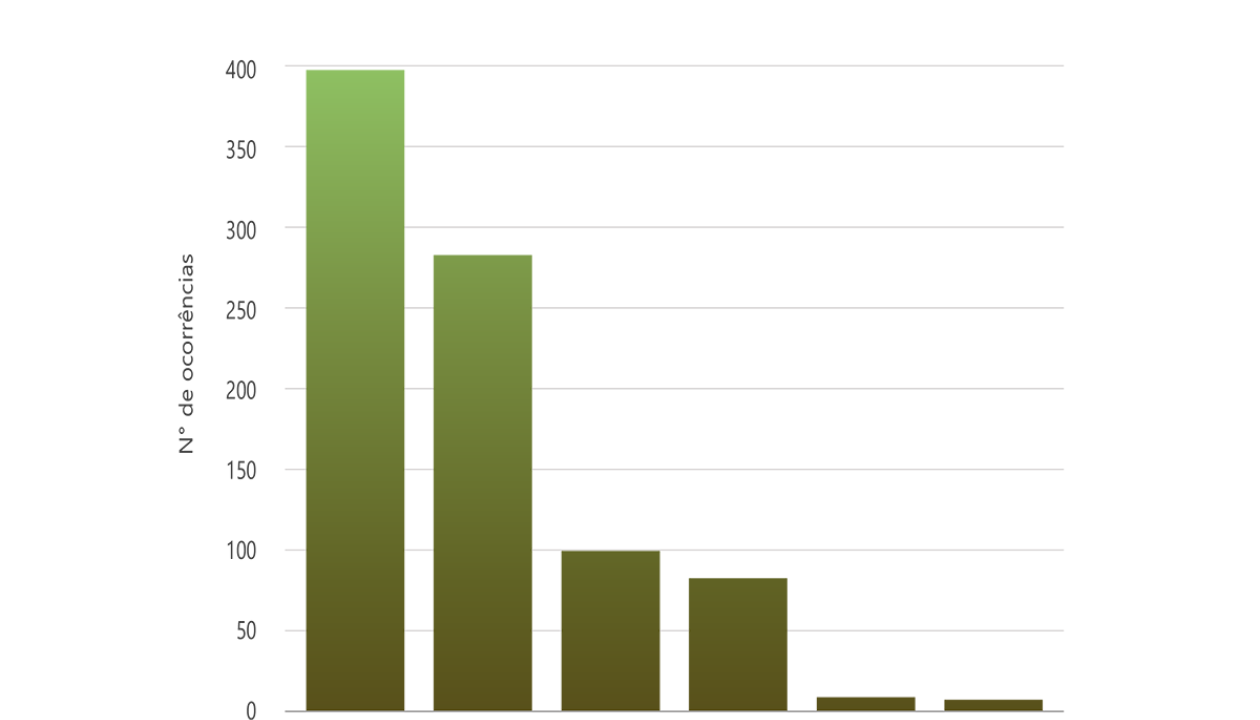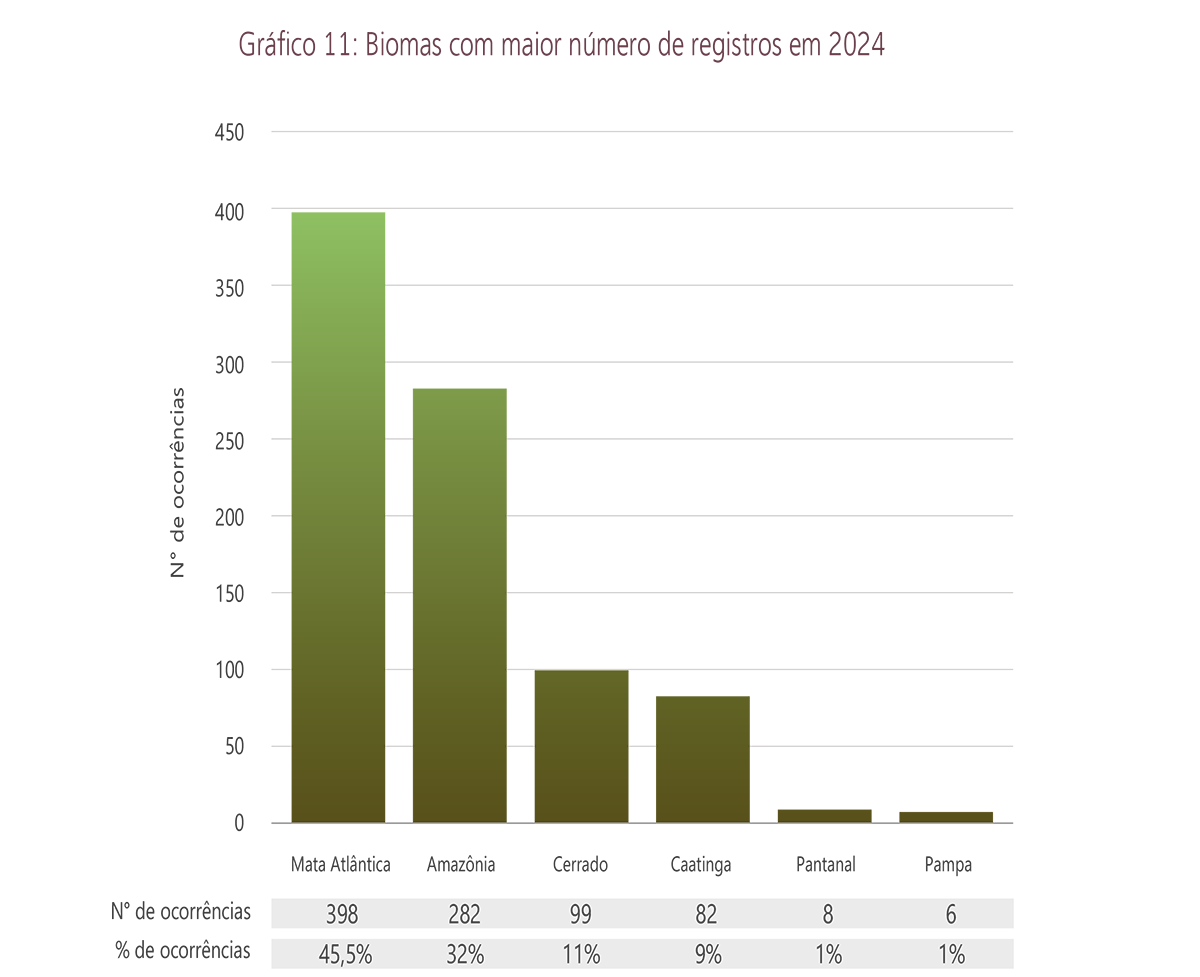 O bioma com o maior número de registros de conflito foi a Mata Atlântica (46%), seguido da Amazônia (32%), Cerrado (11%) e Caatinga (9%).