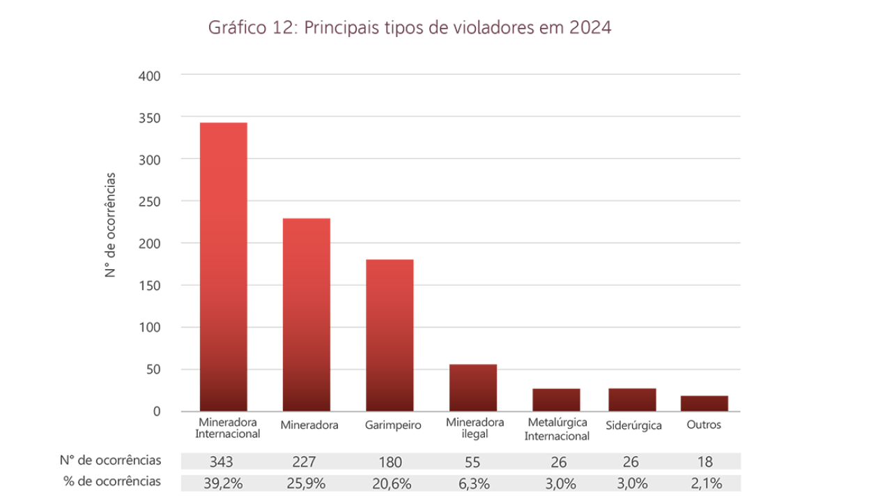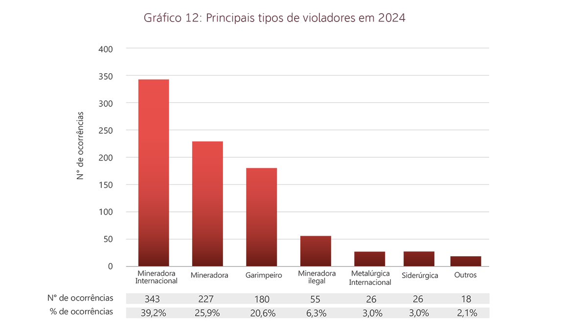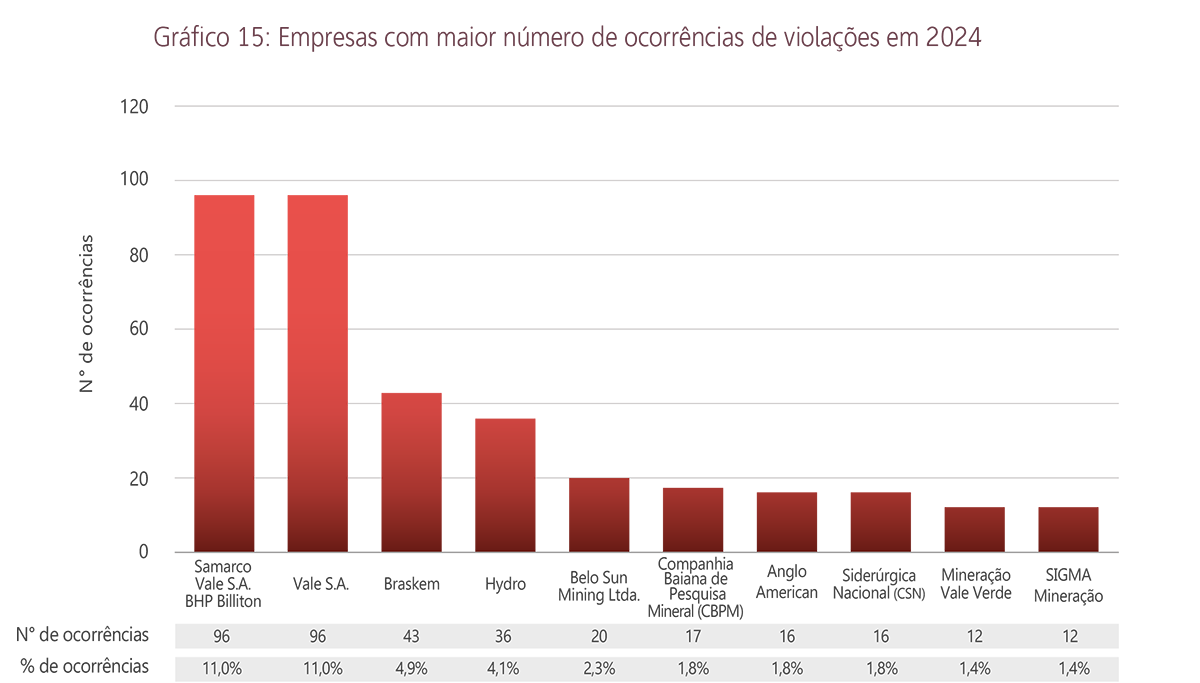 Entre as 150 empresas maiores violadoras mapeadas pelo relatório estão a Vale S.A. e a Samarco-Vale-BHP, com 96 ocorrências cada, seguidas pela Braskem (43 ocorrências), Hydro (36), Belo Sun Mining Ltda (20), Companhia Baiana de Pesquisa Mineral (17), Anglo American (16), Companhia Siderúrgica Nacional (16), Mineração Vale Verde (12) e SIGMA (12).