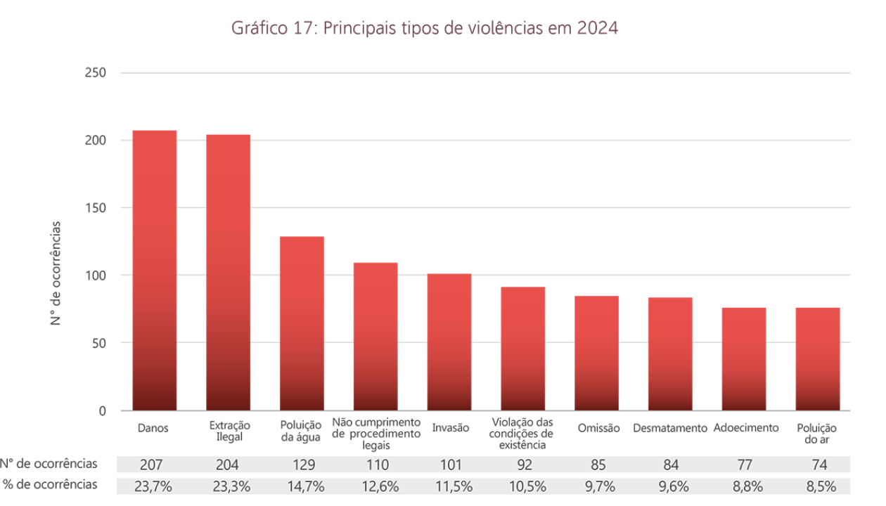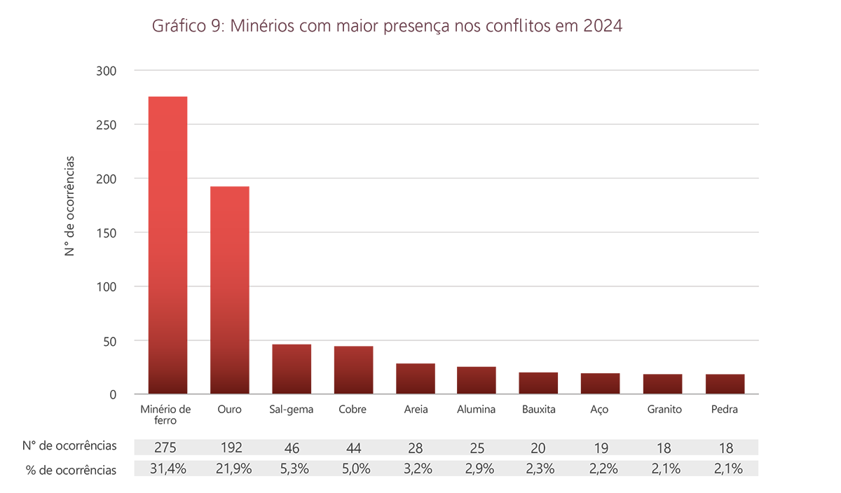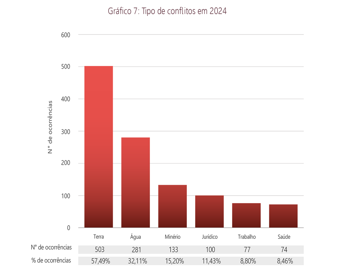 Os conflitos por terra e por água continuaram os mais recorrentes, com 503 (57,5%) e 281 (32,1%) ocorrências, respectivamente. A extração ilegal de minério, em particular os garimpos, gerou 212 ocorrências em 155 localidades de 18 estados, representando 24,2% das ocorrências de 2024, quase ¼ do total.