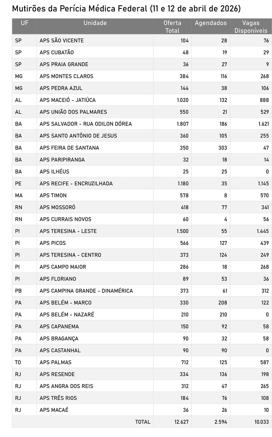 O Ministério da Previdência Social, por meio da Perícia Médica Federal, e o Instituto Nacional do Seguro Social (INSS) realizarão mutirão nos dias 11 e 12 de abril em cidades de 12 estados brasileiros. Serão realizadas 12.627 perícias médicas para benefícios por incapacidade e assistenciais (BPC/LOAS), contribuindo para a redução do tempo de espera dos cidadãos.