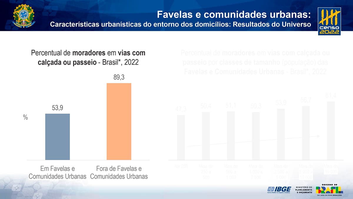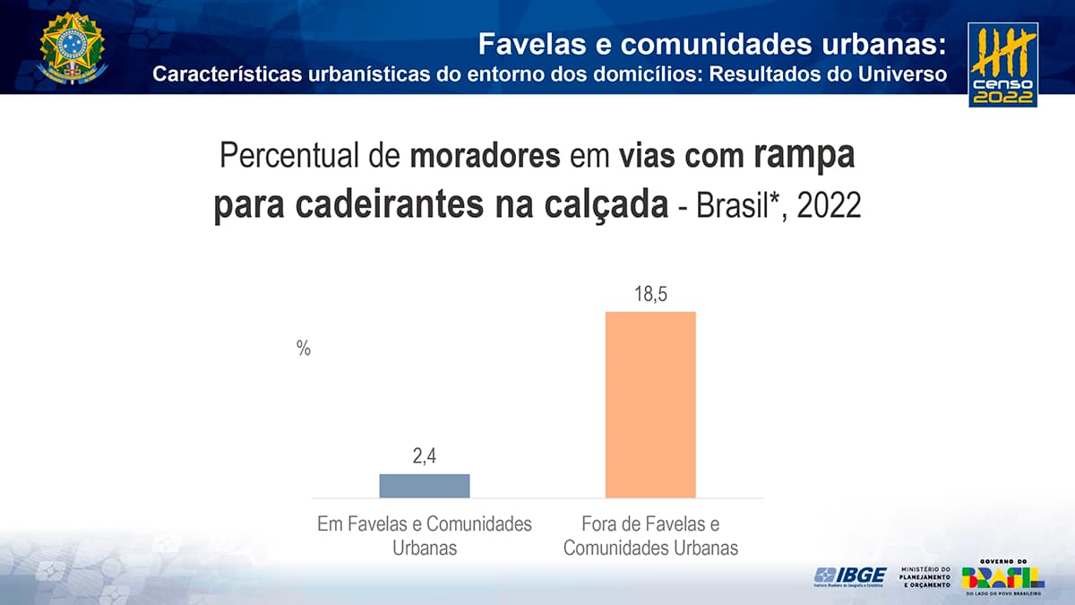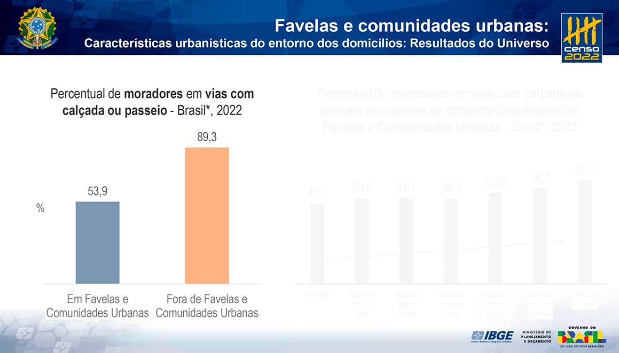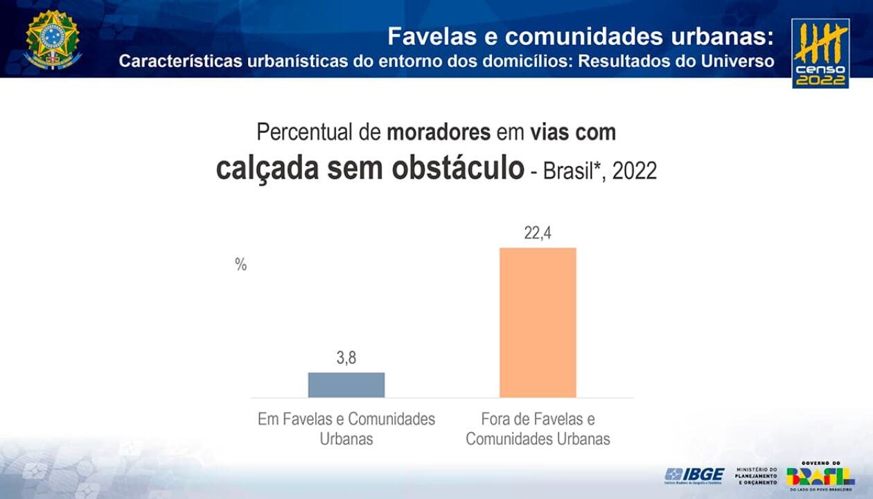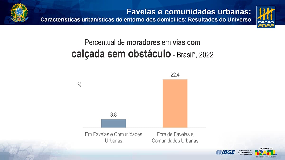 Os dados integram o ‘Censo Demográfico 2022 - Favelas e Comunidades Urbanas: Características urbanísticas do entorno dos domicílios’, divulgado pelo Instituto Brasileiro de Geografia e Estatística (IBGE). Os indicadores foram apresentados levando-se em conta o conjunto do país, grandes regiões, estados, municípios, favelas e comunidades urbanas e recortes territoriais. Os quesitos investigados são: Capacidade máxima de circulação da via, Pavimentação da via, Bueiro ou boca de lobo, Iluminação pública, Ponto de ônibus ou van, Sinalização para bicicleta, Calçada ou passeio, Obstáculo na calçada, Rampa para cadeirantes, e Arborização.