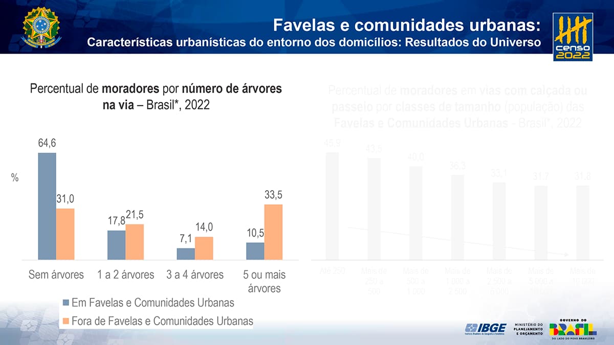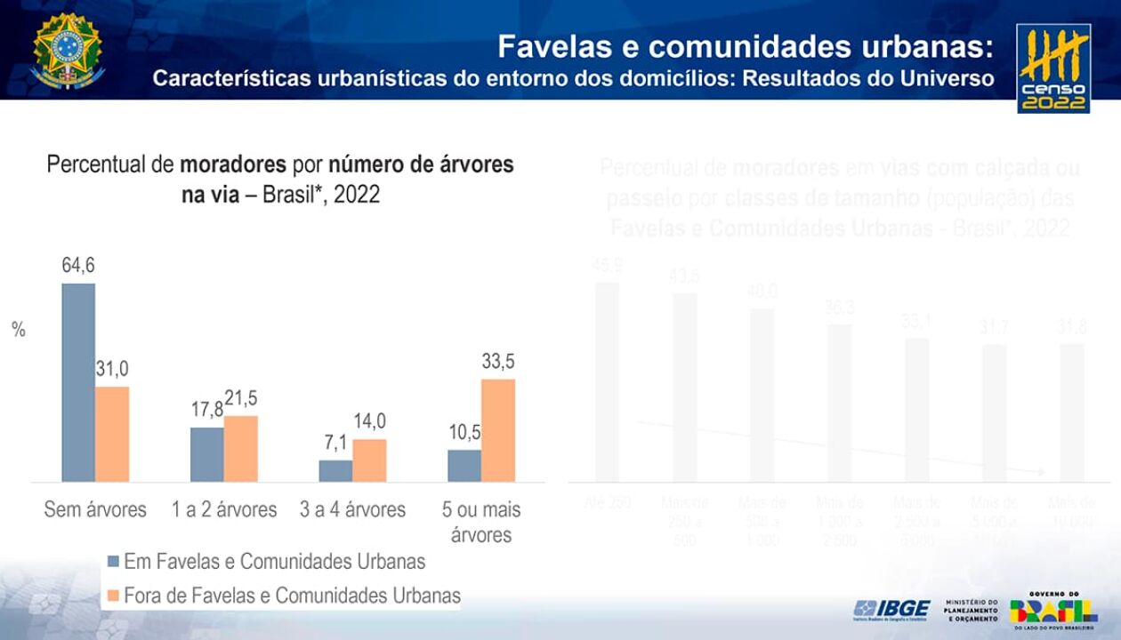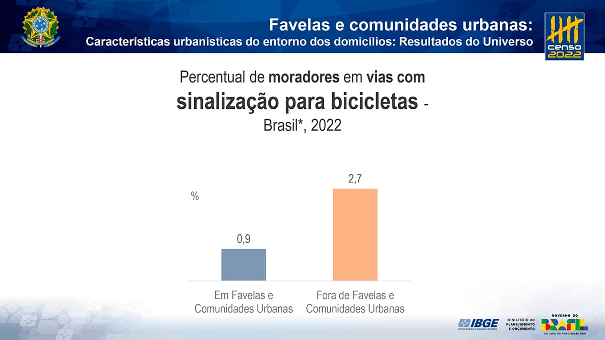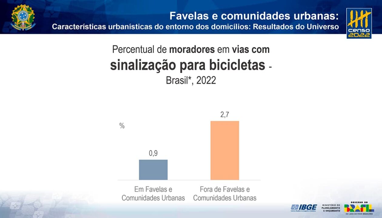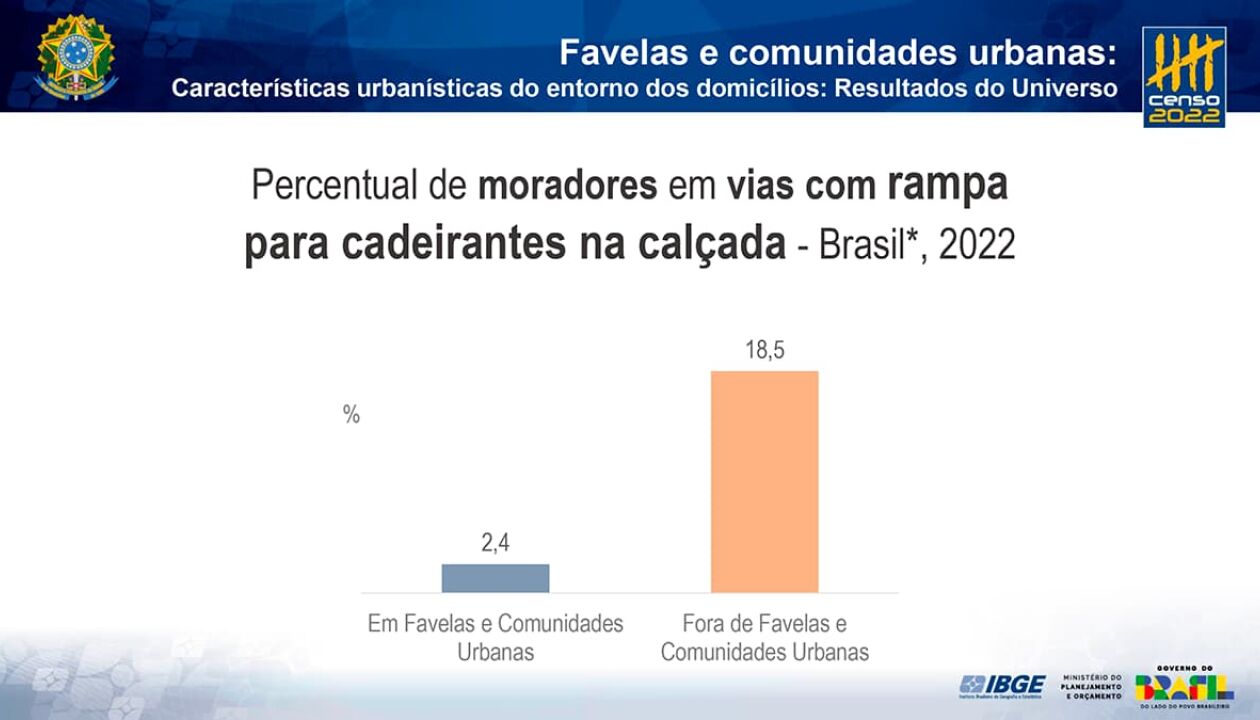 Os dados integram o ‘Censo Demográfico 2022 - Favelas e Comunidades Urbanas: Características urbanísticas do entorno dos domicílios’, divulgado pelo Instituto Brasileiro de Geografia e Estatística (IBGE). Os indicadores foram apresentados levando-se em conta o conjunto do país, grandes regiões, estados, municípios, favelas e comunidades urbanas e recortes territoriais. Os quesitos investigados são: Capacidade máxima de circulação da via, Pavimentação da via, Bueiro ou boca de lobo, Iluminação pública, Ponto de ônibus ou van, Sinalização para bicicleta, Calçada ou passeio, Obstáculo na calçada, Rampa para cadeirantes, e Arborização.