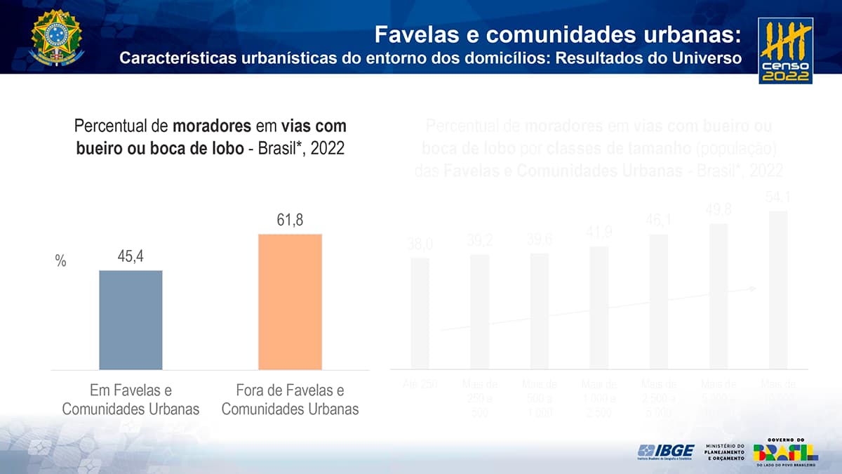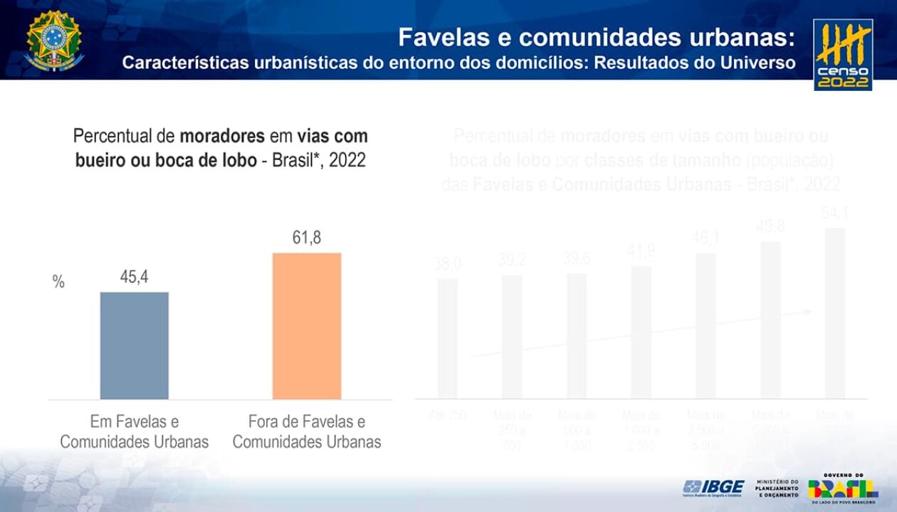 Menos da metade (45,4%) dos moradores de favelas viviam em trechos de vias com bueiro ou boca de lobo, totalizando 7,3 milhões de pessoas, enquanto 54,6% (8,8 milhões) viviam em trechos sem a presença dessa infraestrutura. Já nas áreas fora de favelas, a proporção sobe para 61,8% de habitantes que viviam em trechos de vias com esse equipamento.