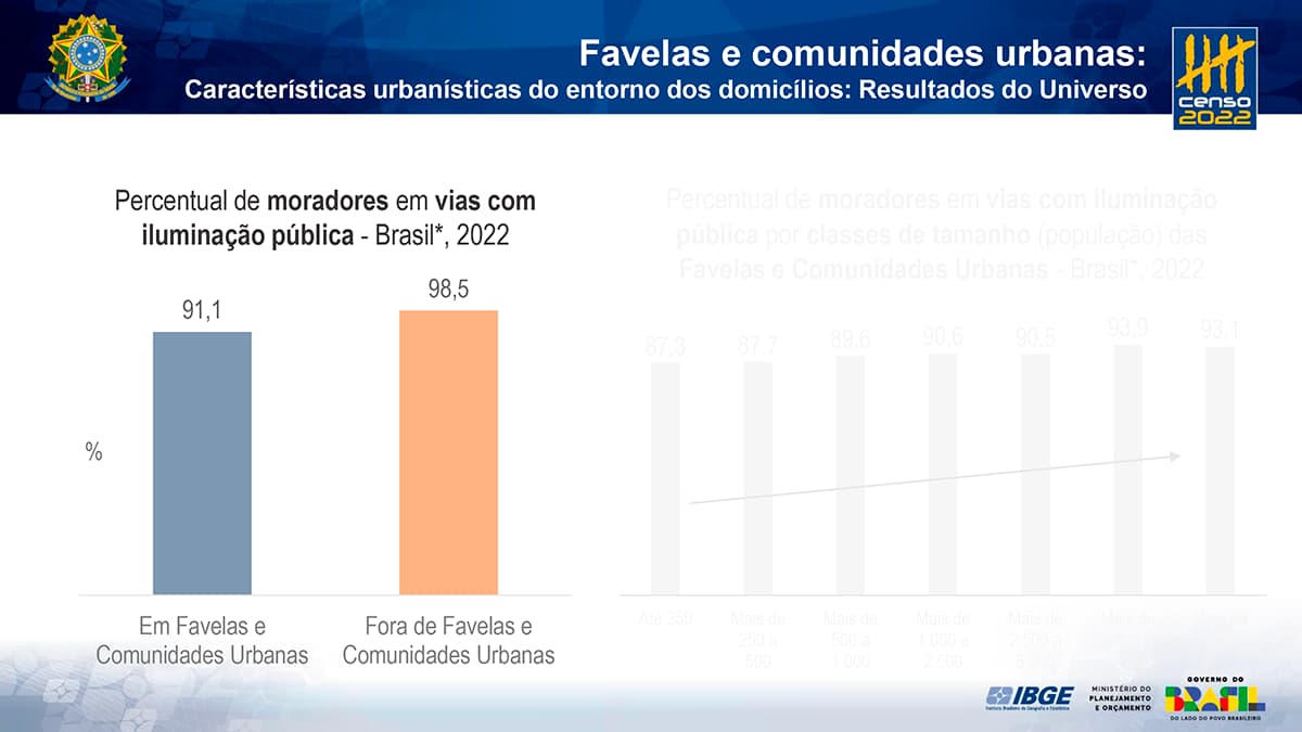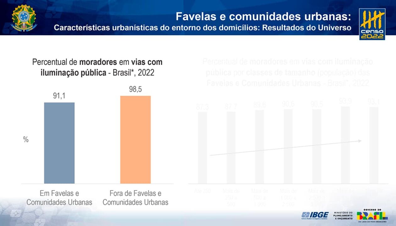 Nove em cada dez moradores (91,1%) de favelas viviam em trechos de via com iluminação pública, totalizando 14,7 milhões de pessoas, enquanto 8,9% (1,4 milhão) viviam em trechos sem iluminação pública. Nas áreas fora desses territórios, a proporção de pessoas que moravam em trechos de via com esse equipamento urbano é maior (98,5%).