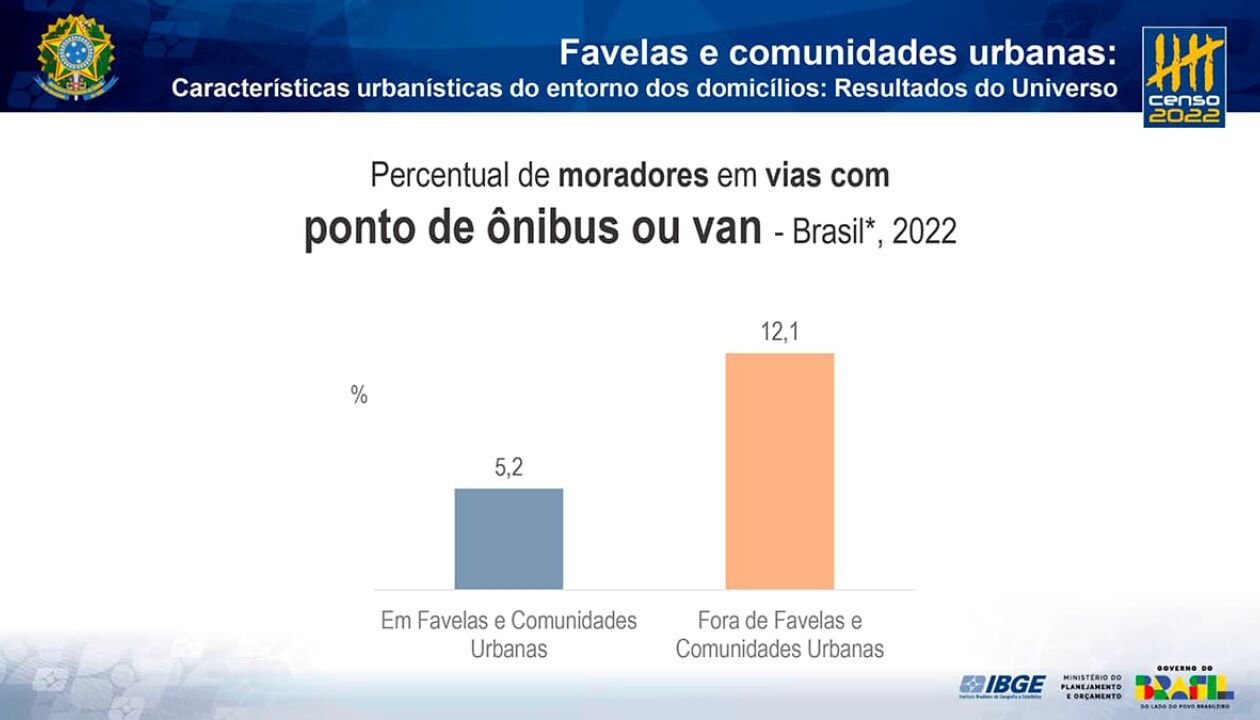 Apenas 5,2% (835.936 pessoas) dos moradores de favelas viviam em trechos de vias com ponto de ônibus ou van. Fora dessas áreas, a proporção de pessoas com disponibilidade dessa infraestrutura urbana no seu trecho de via era mais que o dobro (12,1%).