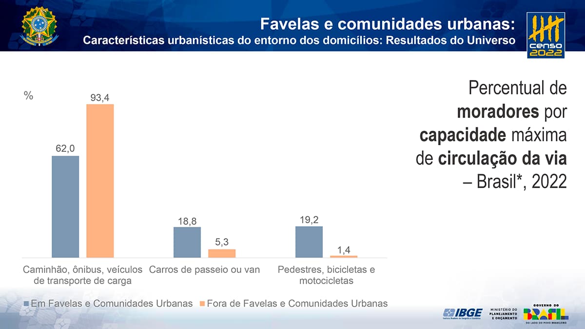 Nas 12.348 favelas e comunidades urbanas de 656 municípios brasileiros, onde vivem 16.390.790 pessoas, 19,2% delas (3.107.925) moram em trechos de vias onde só é possível a circulação de motocicletas, bicicletas e pedestres. Outros 18,8% dos moradores (3.032.843) vivem em trechos com capacidade para circulação de carro ou van e 62% (10.025.652) moram em domicílios com vias com capacidade máxima de circulação por caminhão, ônibus e veículos de transporte de carga.