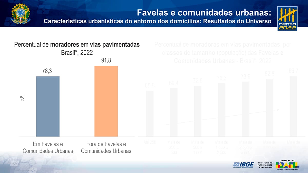 Em 2022, 78,3% dos moradores de favelas viviam em trechos de vias pavimentados, totalizando 12,7 milhões de pessoas, enquanto 21,7% (3,5 milhões) residiam em trechos sem pavimentação. Fora desses territórios, 91,8% dos habitantes viviam em trechos de vias pavimentadas.
