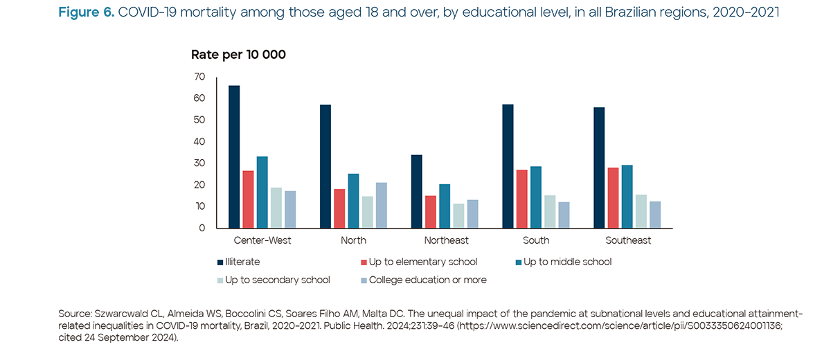 No Brasil, segundo o relatório, pessoas sem educação básica tiveram probabilidade até três vezes maior de morrer por Covid-19 do que aquelas com ensino superior. Países com maiores níveis de desigualdade também registraram taxas mais elevadas de mortalidade por Covid-19, maior incidência de HIV e mais dificuldades para implementar respostas eficazes.