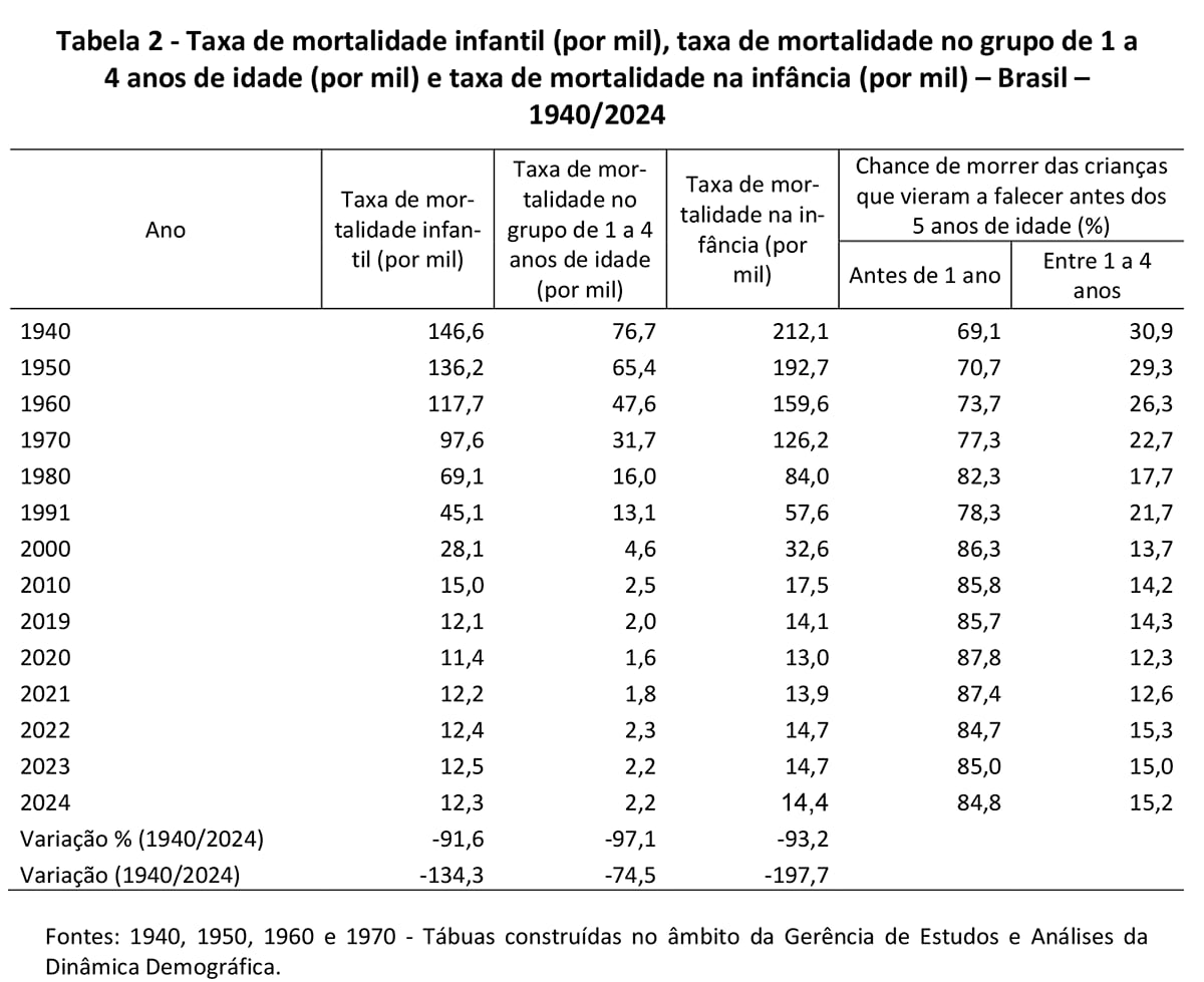 Em 2024, a taxa de mortalidade infantil (crianças com menos de um ano de idade) para ambos os sexos, no país, era de 12,3 para cada mil crianças nascidas vivas. Esse indicador se reduziu significativamente desde 1940, quando, para cada mil nascidos vivos, aproximadamente 146,6 crianças não completariam o primeiro ano de vida.
