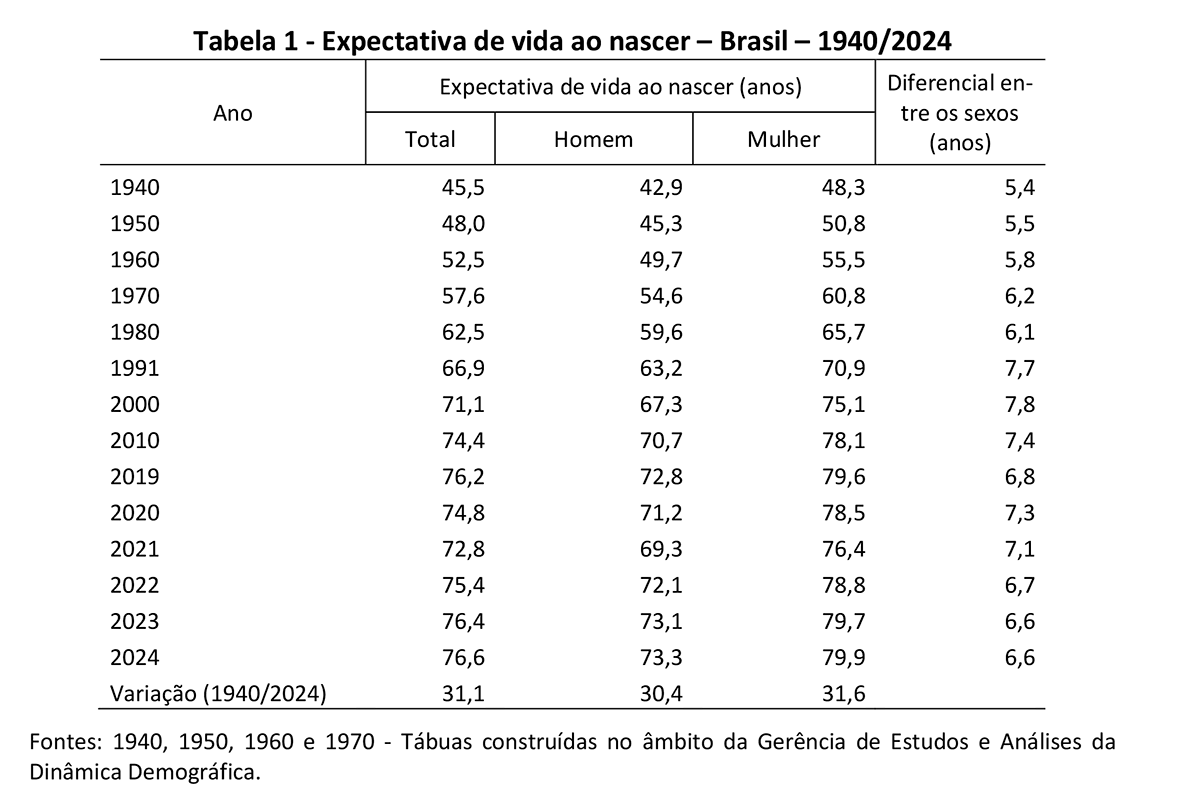 A longevidade da população brasileira aumentou bastante nas últimas nove décadas. Quem nasceu em 1940 viveria, em média, 45,5 anos. Já em 2024, a expectativa de vida ao nascer chegou a 76,6 anos, representando um aumento de 31,1 anos neste período.