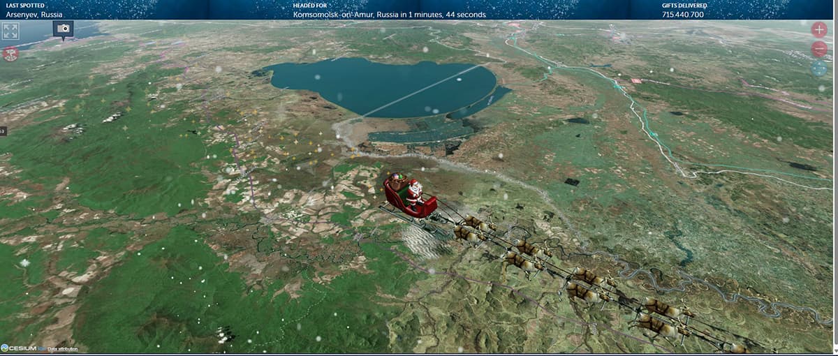 Às 10h da manhã do dia 24/12 (hora de Brasília), o Papai Noel estava saindo de Arsenyev a caminho de Komsomolsk-on-Amur, na Russia, com mais de 715 milhões de presentes distribuídos (www.noradsanta.org/en/map)Rastrear o Papai Noel