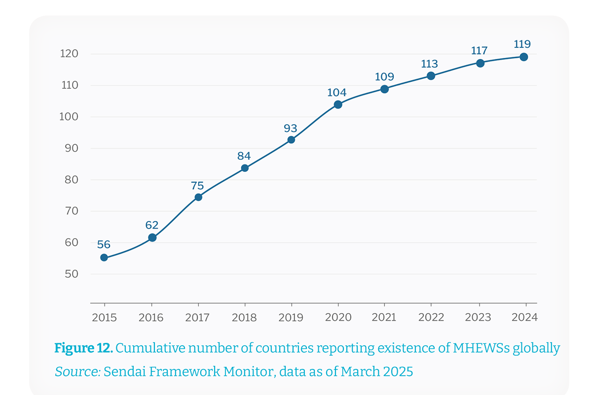 Desde 2015, o número de países que relatam Sistemas Eficazes De Alerta Precoce Para Múltiplos Riscos (MHEWSs) mais que dobrou (de 56 para 119 em 2024), sendo que 40% dos países ainda não possuem MHEWSs (Fonte: Relatório Estado do Clima)Calor do oceano