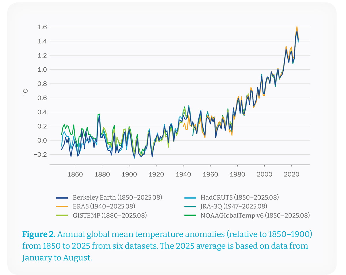 Gráfico de linhas mostrando as diferenças na temperatura média global de 1850 a 2025, com múltiplos conjuntos de dados, exibindo um aumento constante desde 1900, atingindo um pico acima de 1,5°C por volta de 2020 (Fonte: Relatório Estado do Clima)Conforme a OMM, os últimos três anos, de 2023 a 2025, foram os três anos mais quentes em todos os oito conjuntos de dados.