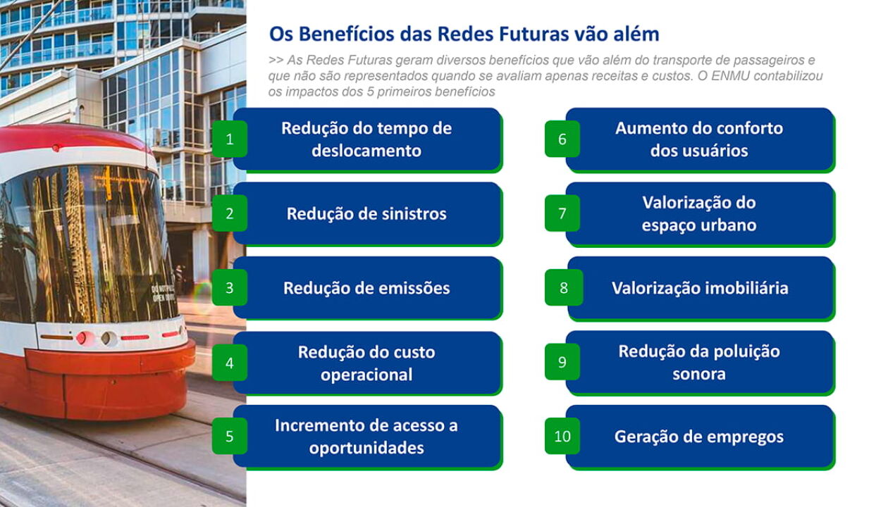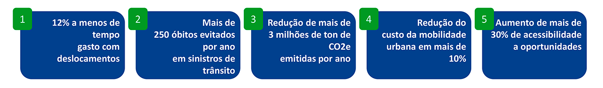 Outros benefícios incluem a redução do custo da mobilidade urbana em cerca de 10%, considerando sistemas mais eficientes, e o aumento do acesso da sociedade a empregos, escolas, hospitais e áreas de lazer em menor tempo. Haverá, também, a redução no tempo médio de deslocamentos nas cidades, com um impacto econômico estimado de mais de R$ 200 bilhões.