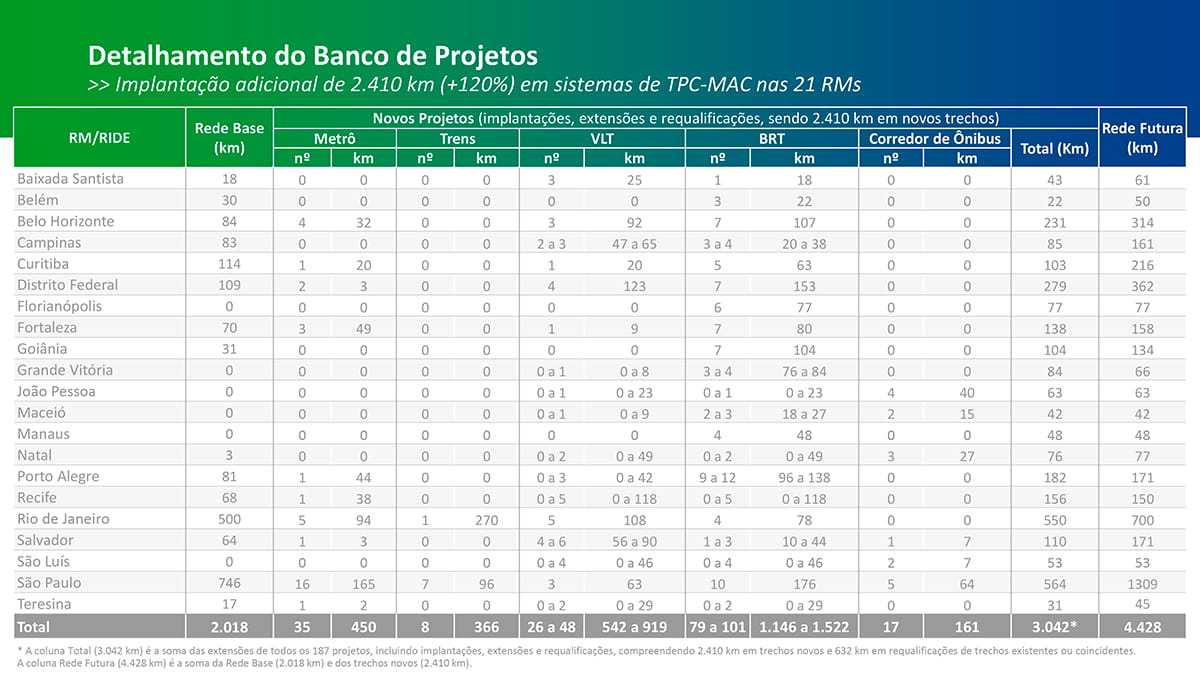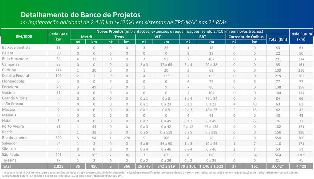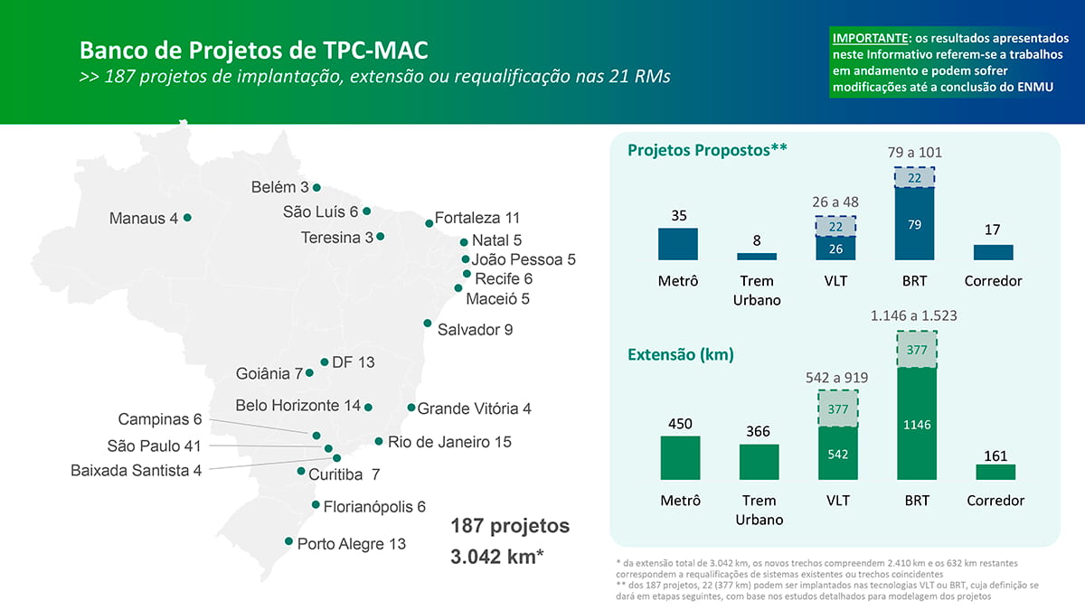 Fonte: Estudo Nacional de Mobilidade Urbana (ENMU)O estudo levou em consideração os 187 projetos de transporte público de média ou alta capacidade considerados estratégicos (TPC-MAC) nas 21 maiores regiões metropolitanas (RM) do país. A estimativa considera os investimentos em infraestrutura e frota de metrô, trem, VLT, BRT e corredores, com as projeções de demanda até 2054.