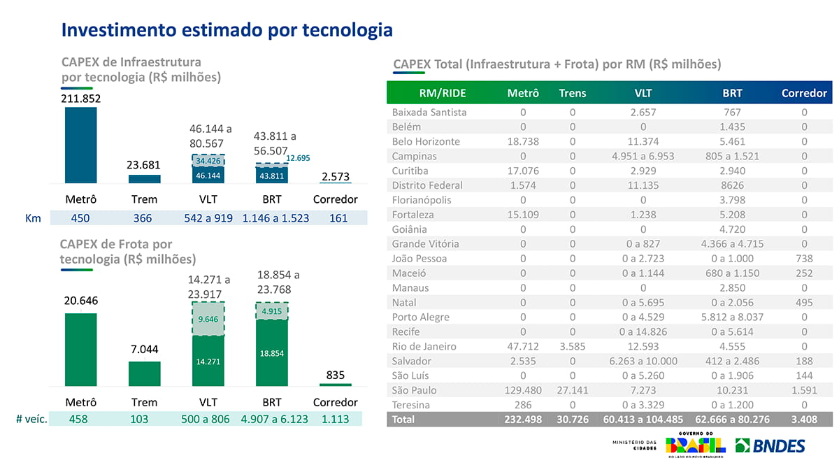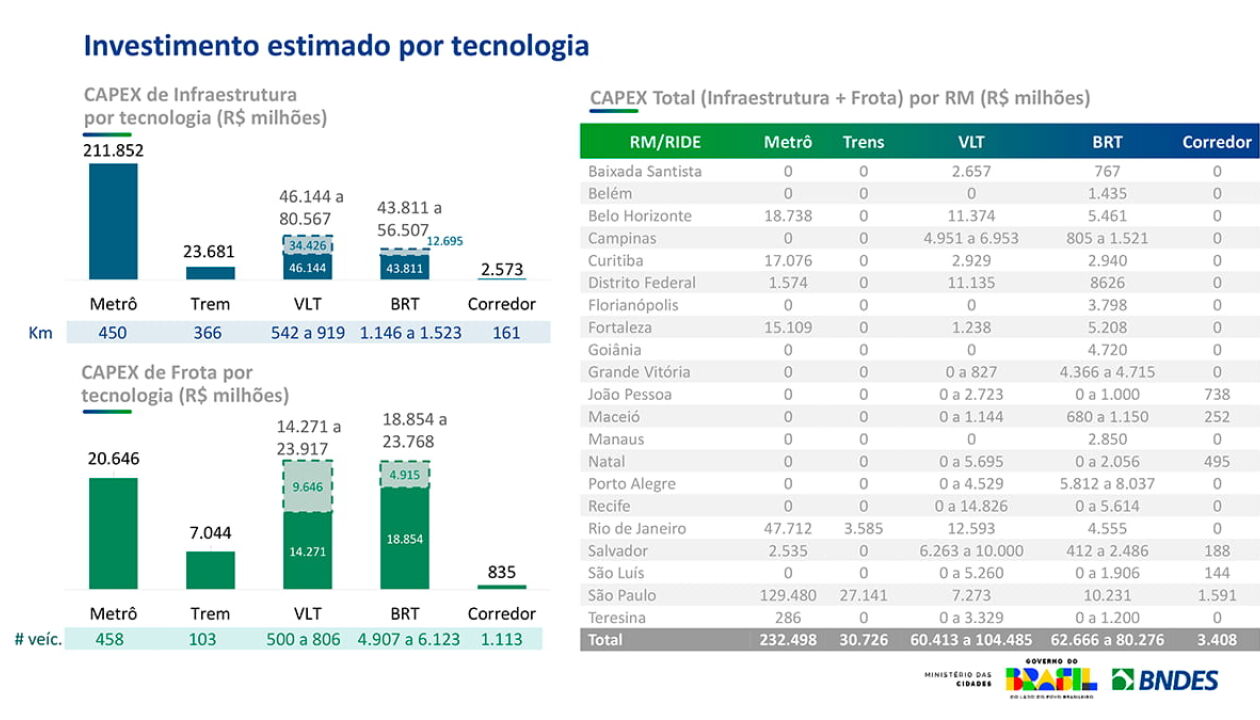 Do total, R$ 230 bilhões seriam investidos em metrôs, R$ 31 bilhões em trens, até R$ 105 bilhões em veículos leves sobre trilhos (VLT), até R$ 80 bilhões em bus rapid transit (BRT) e R$ 3,4 bilhões em corredores exclusivos de ônibus.