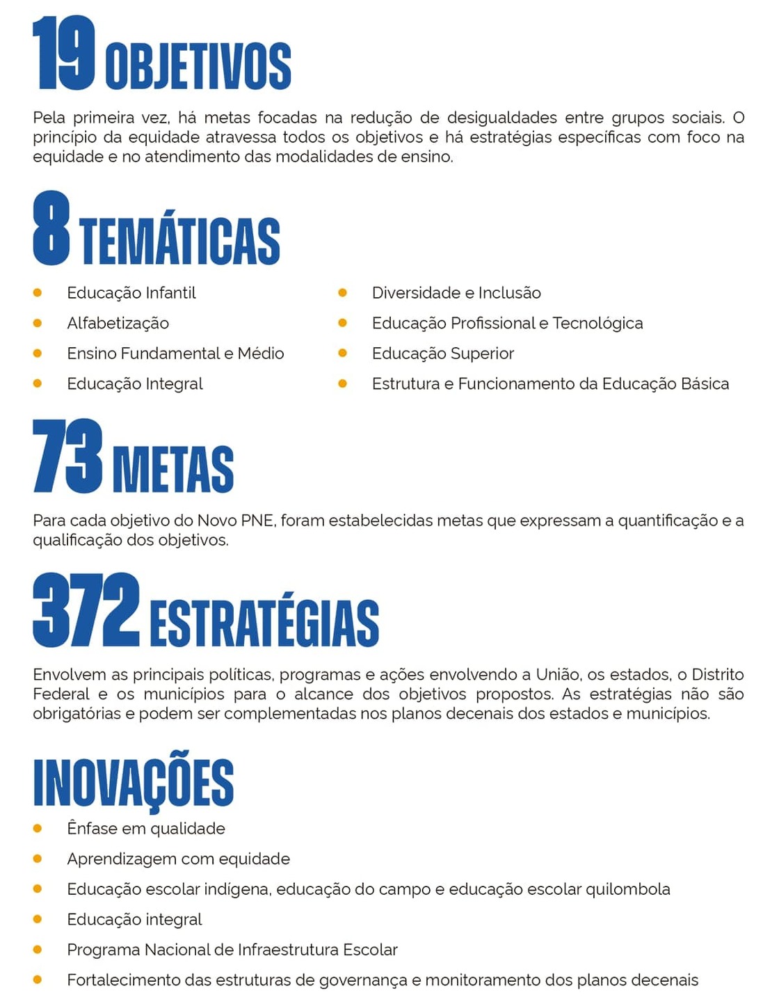 No total, o novo plano tem 19 objetivos, 73 metas e 372 estratégias e traz novos compromissos com a aprendizagem, a inclusão e a equidade.