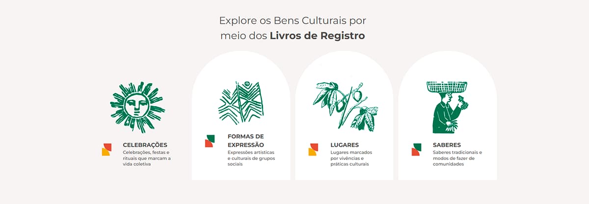 São quatro arquivos: o Livro dos Saberes; o das Celebrações; o das Formas de Expressão; e o dos Lugares. (A título de comparação, bens de natureza material são inscritos em Livros do Tombo, de onde vem o termo “tombamento”, para o seu reconhecimento pelo Iphan.)