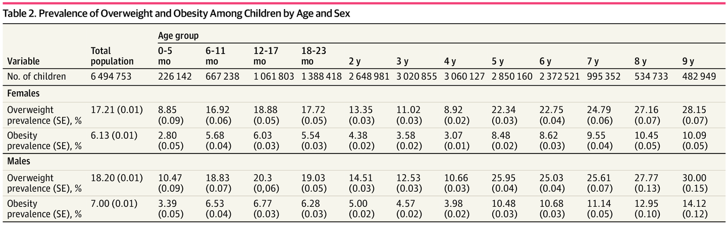 A prevalência estimada de obesidade aos 5 anos de idade foi de 8,48%, aumentando para 10,09% aos 9 anos de idade. A obesidade foi mais frequente em meninos (14,12%) do que em meninas (10,09%) aos 9 anos de idade. Entre as meninas, a prevalência de obesidade foi de 11,8% entre as que se identificaram como brancas, 9,12% entre as que se identificaram como pardas e 7,46% entre as que se identificaram como indígenas.
