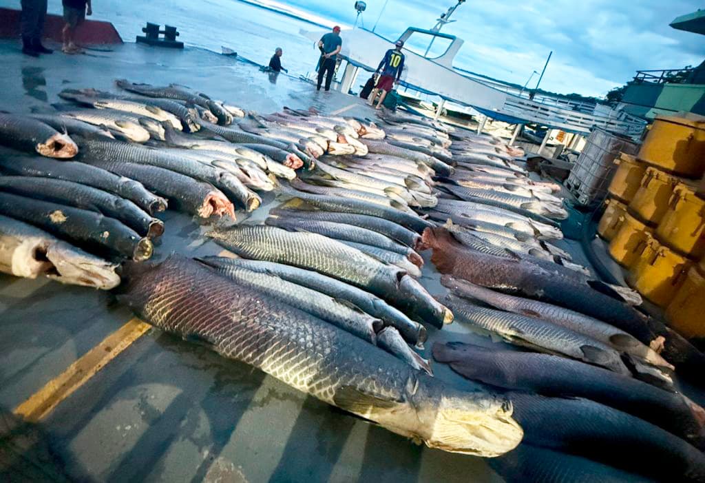 Mais de 16 toneladas de pescado ilegal das espécies de Pirarucu, Jaraqui e Aruanã foram apreendidas pela Polícia Militar do Amazonas (PMAM), durante operação na Base Arpão 2, nas proximidades de Coari, a 363 quilômetros de Manaus (Divulgação-SSP/AM)Com informações do ICMBio e do MMA.