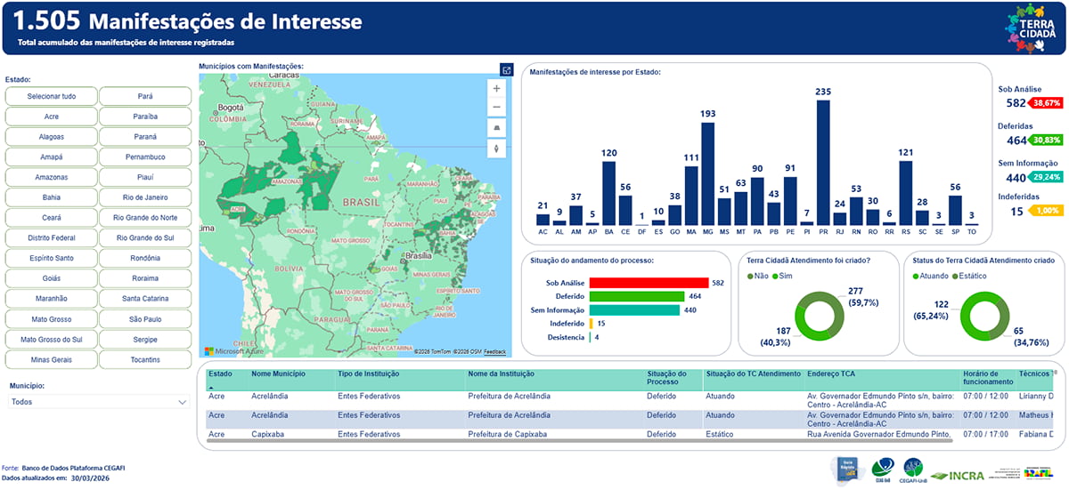 Em todo o Brasil, são 1.505 manifestações de interesse de adesão ao Terra Cidadã, conforme o Painel de Manifestações de Interesse (03/04/26). Desse total, 464 pedidos foram acatados, outros 582 estão em análise. Os estados com mais pedidos são Paraná (235), Minas Gerais (193), Rio Grande do Sul (121) e Bahia (120).