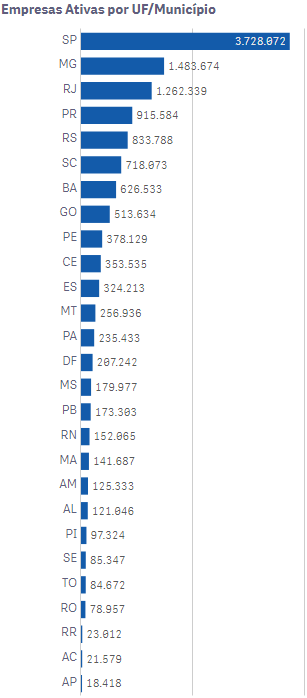 O Brasil conta com 24.947.586 empresas em atividade, segundo a base de dados do Cadastro Nacional da Pessoa Jurídica (CNPJ), com números atualizados até o mês de novembro/2025. Destas, 23.402.116 são consideradas microempresas ou empresas de pequeno porte (93,8%).