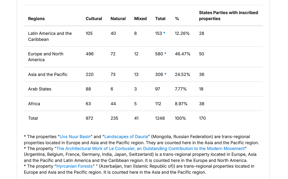 A Lista do Patrimônio Mundial inclui 1.248 propriedades, incluindo 972 bens culturais, 235 bens naturais e 41 bens mistos em 170 paísesO relatório People and Nature in Unesco-Designated Sites - Global and local contributions (Comunidades e natureza nos sítios da Unesco: contribuições locais e globais), publicado pela Organização das Nações Unidas para a Educação, a Ciência e a Cultura (Unesco), divulgado em Paris, destaca a grande contribuição dos sítios protegidos para as pessoas e o meio ambiente.