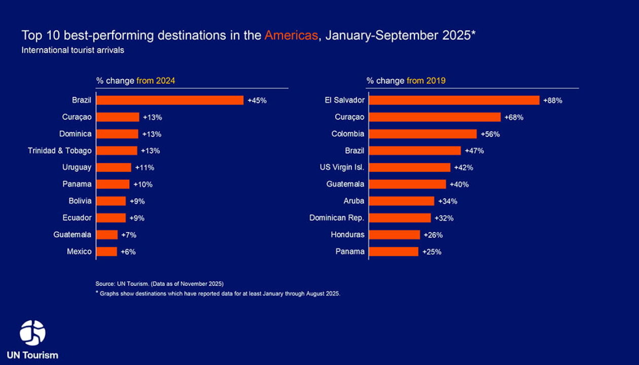 Segundo o Barômetro Mundial do Turismo da ONU (World Tourism Barometer), o Brasil ocupa o segundo lugar no ‘Top 20’ dos destinos com melhor desempenho no percentual de chegadas de turistas internacionais, comparando o período de janeiro a setembro de 2025 com o mesmo período de 2024.