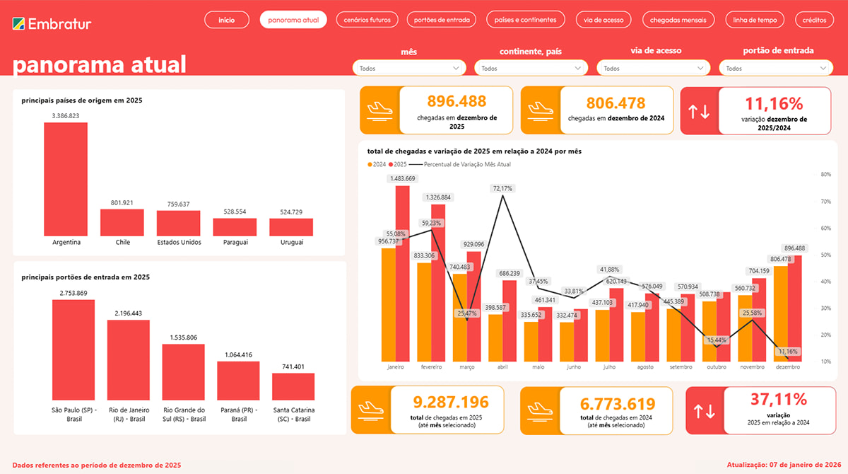 O número de 2025 representa um crescimento de 37,1% em relação a 2024. Além de superar o desempenho do ano anterior, o país também ultrapassou, com folga, a meta prevista no Plano Nacional de Turismo (PNT) 2024/2027, que era de alcançar 6,9 milhões de chegadas internacionais em 2025.