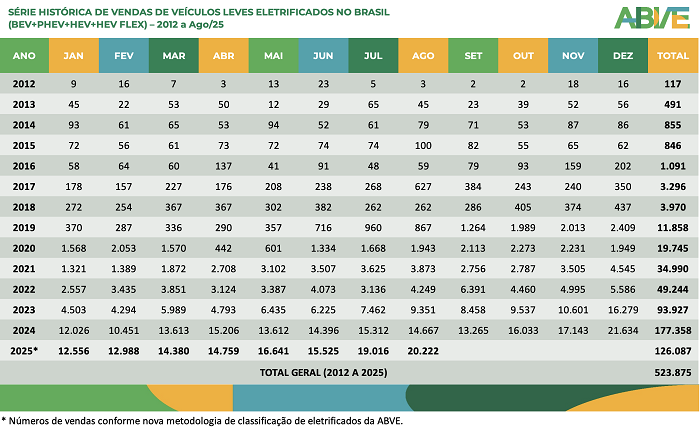 Segundo a Associação Brasileira do Veículo Elétrico (ABVE), com 20.222 unidades vendidas em agosto – 9,4% de participação sobre o mercado automotivo total – os veículos leves eletrificados seguem em crescimento no Brasil e devem passar de 200 mil emplacamentos em 2025. De janeiro a agosto, foram 126.087.