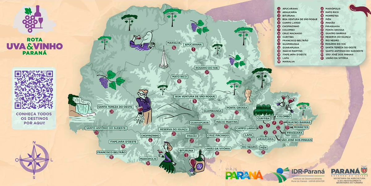 O roteiro reúne propriedades, vinhedos e vinícolas em um mapa digital com sinalização temática e informações históricas e regionais voltadas ao visitanteOs municípios participantes da ‘Rota Uva & Vinho Paraná’ são: